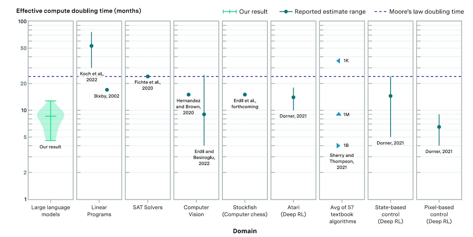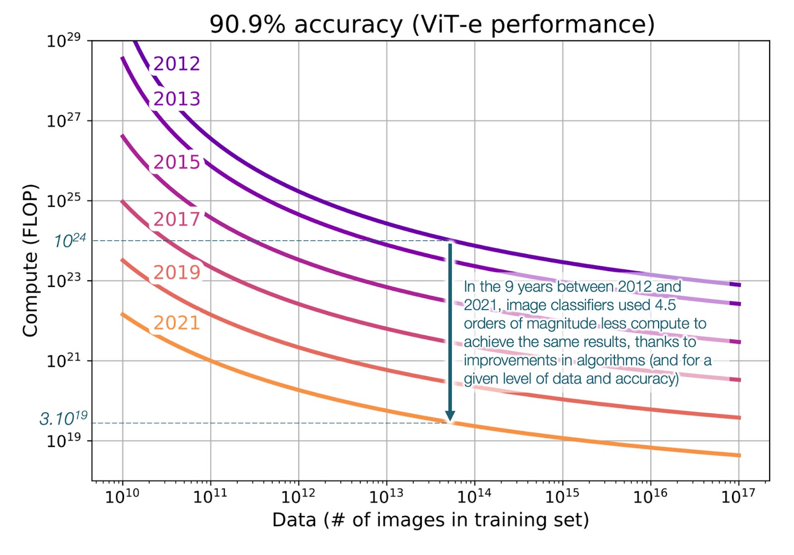 About 0.5 orders of magnitude (OOMs) per year. Crucially, you can see the distance between lines is either the same or increases over time, suggesting that algorithmic improvements don’t slow down, they actually accelerate!