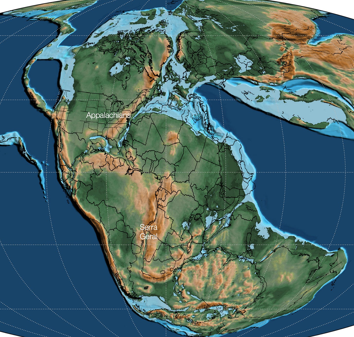 Mientras tanto, al este, los Apalaches, el Escudo Canadiense, el Escudo Brasileño y África formaban parte del mismo antiguo continente.