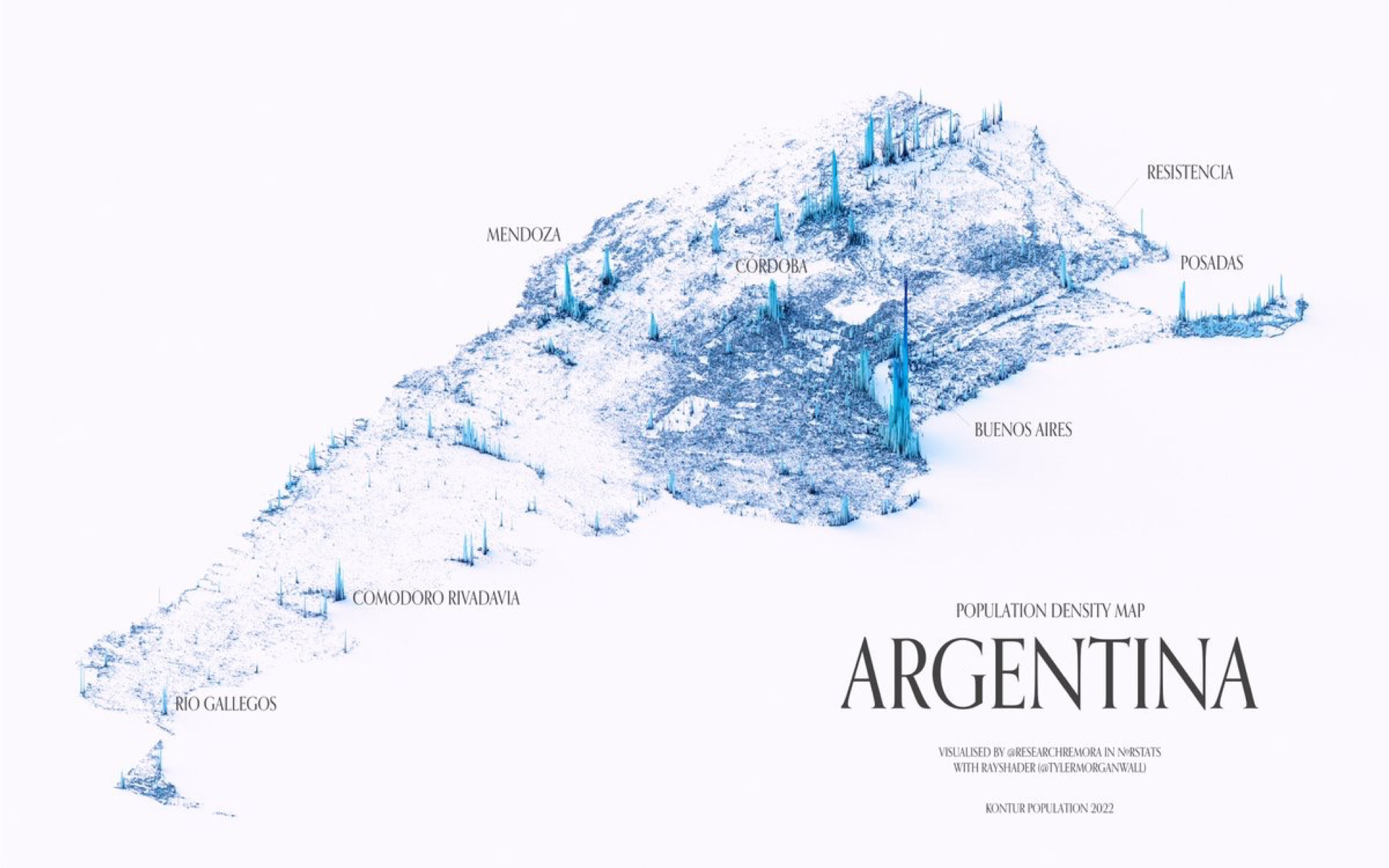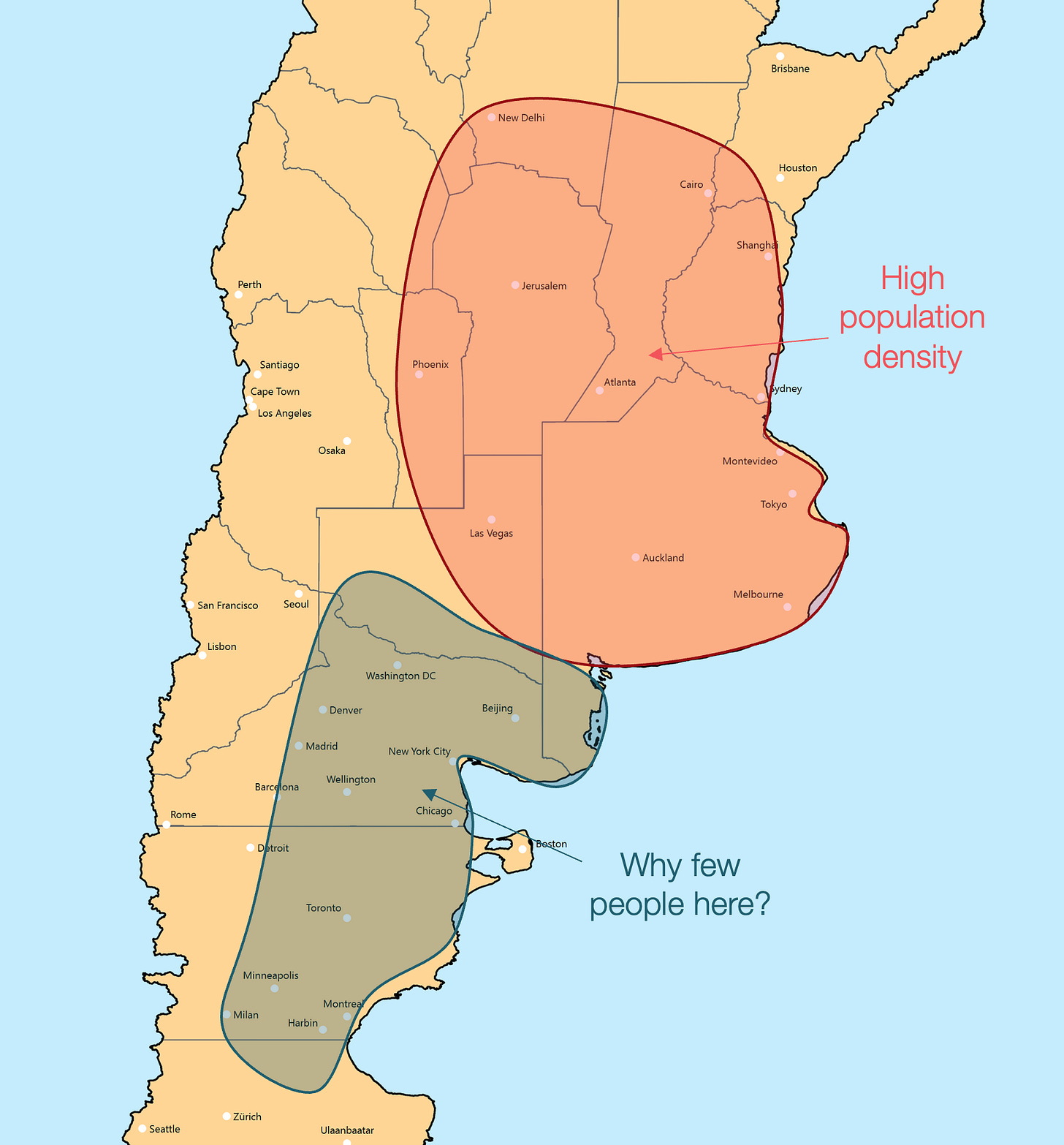 Fuera de Buenos Aires y del pie de los Andes, hay muy poca población, incluso en zonas con climas equivalentes a otros lugares del hemisferio norte que sí están mucho más poblados.