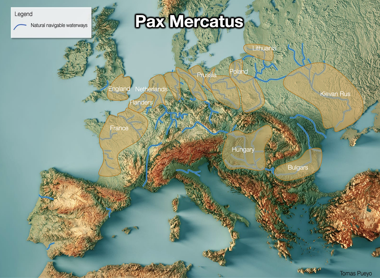Como vimos en Never Bet Against America, el Misisipi constituye una unidad cultural y política porque las poblaciones locales comercian constantemente entre sí y comparten los mismos intereses económicos. No ocurría lo mismo en la costa este de Estados Unidos (donde los ríos fluyen de las montañas al mar), ni ocurre en Europa, motivo por el cual allí surgieron tantas naciones y tantas guerras.