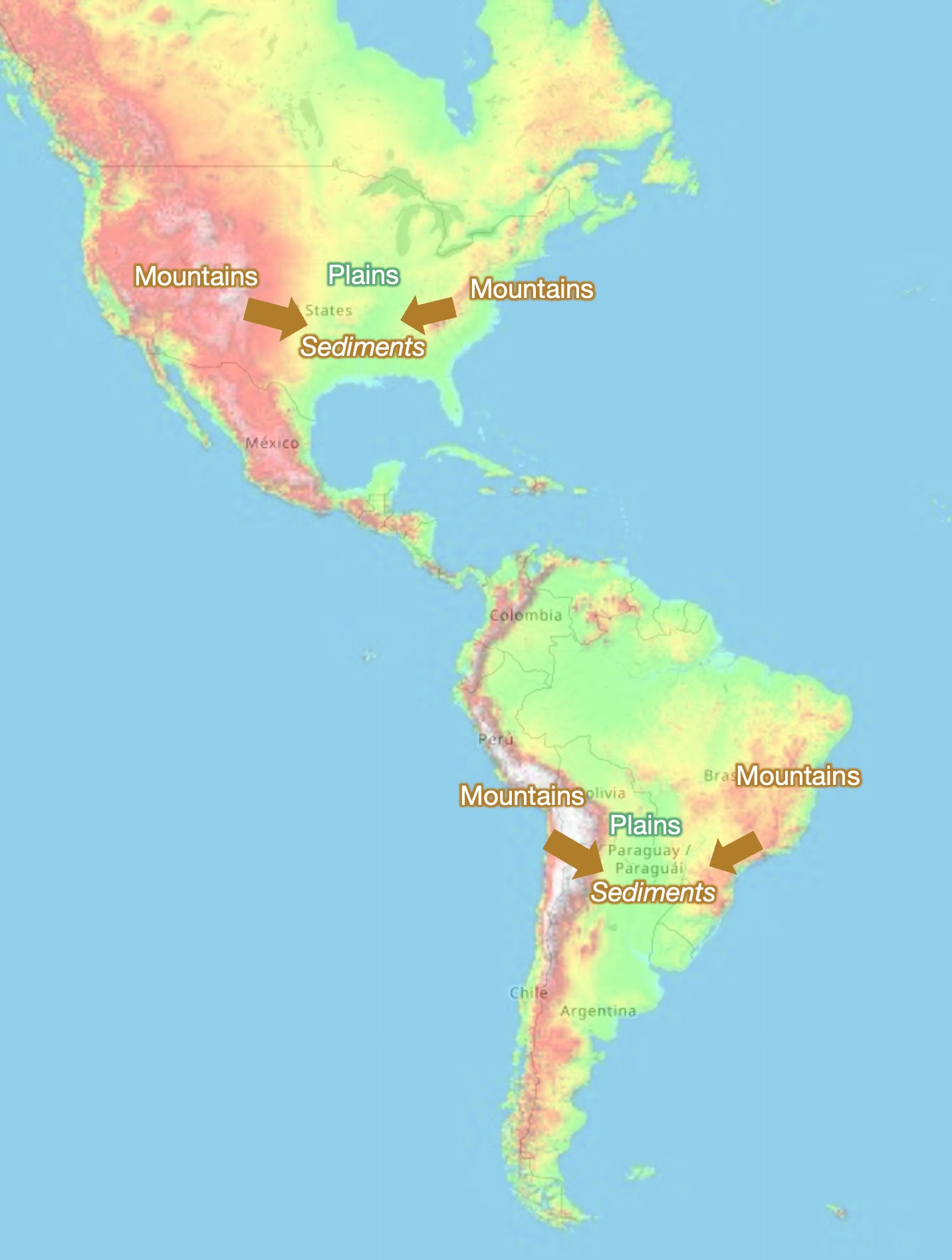 Y esta es la razón por la que ambas zonas son llanuras bajas y planas, con suelos de calidad similar: se formaron del mismo modo! Un mar se formó entre las montañas, se acumularon sedimentos, y cuando el mar retrocedió, los ríos y el viento siguieron depositando más.