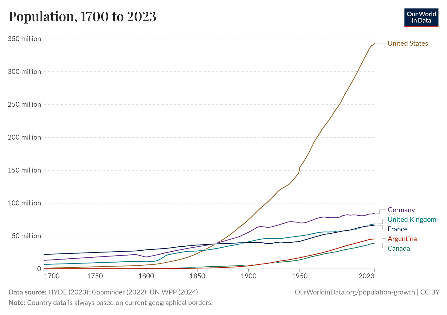 Over the last 250 years, while immigrants were pouring into the US, Argentina was only growing as fast as Canada, which has a much worse climate.