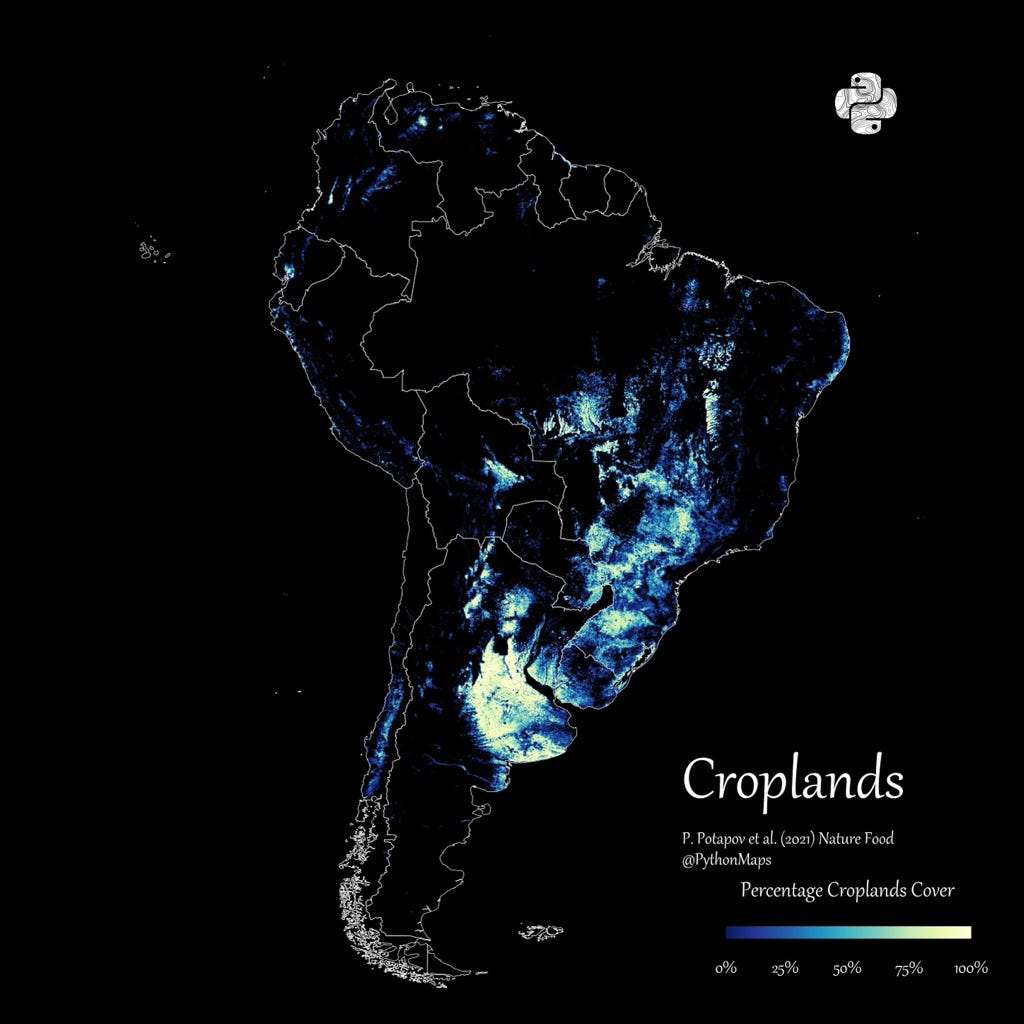 The dark circle represents the Pampas, with the good climate we saw. But it has very few big cities. Look how it compares to the US’s Midwest.