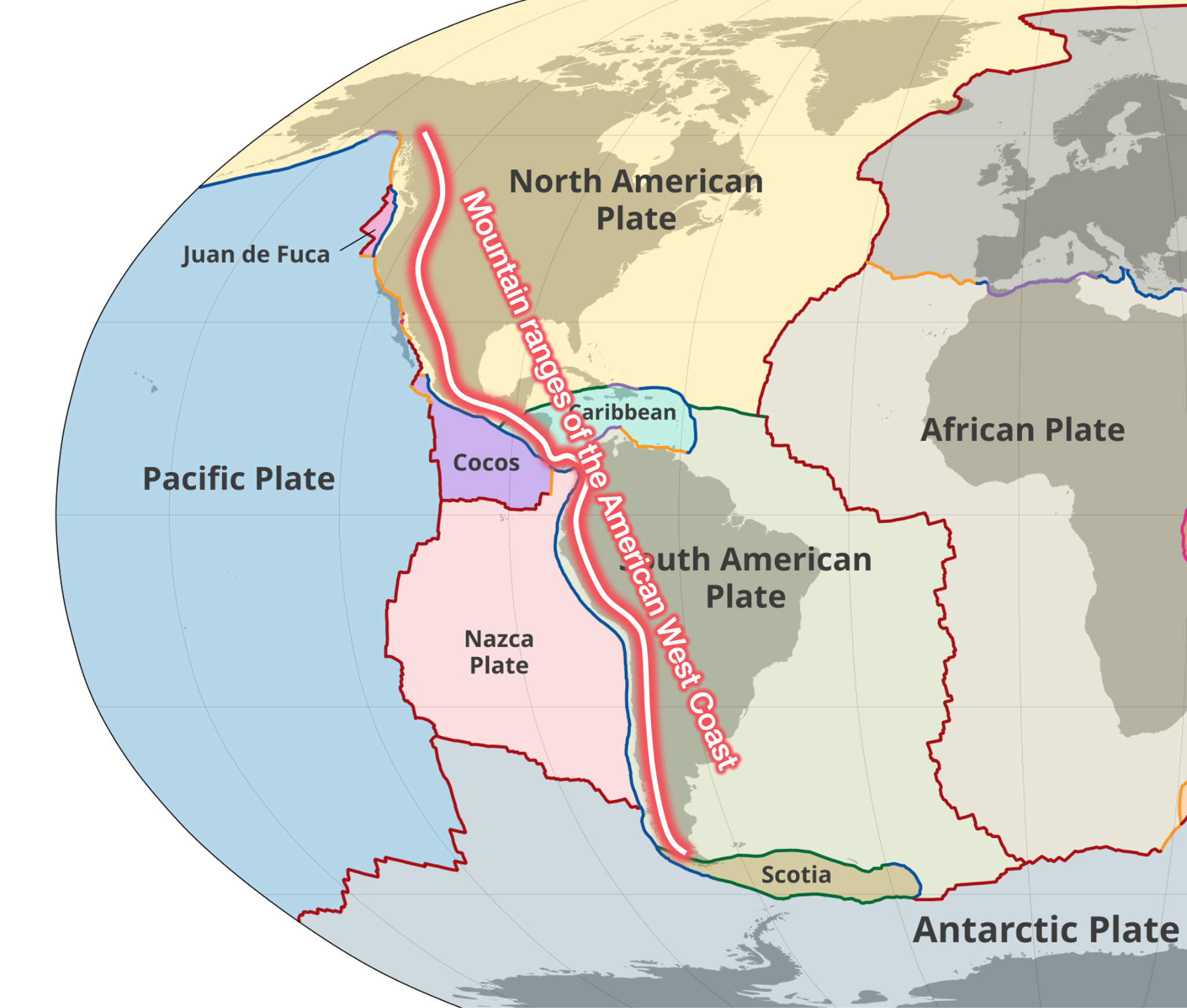 Estas montañas son tan altas porque son jóvenes, producto de la subducción actual de las placas oceánicas (la placa del Pacífico empuja las de Cocos y Nazca hacia el este) bajo las placas continentales (la norteamericana y la suramericana).