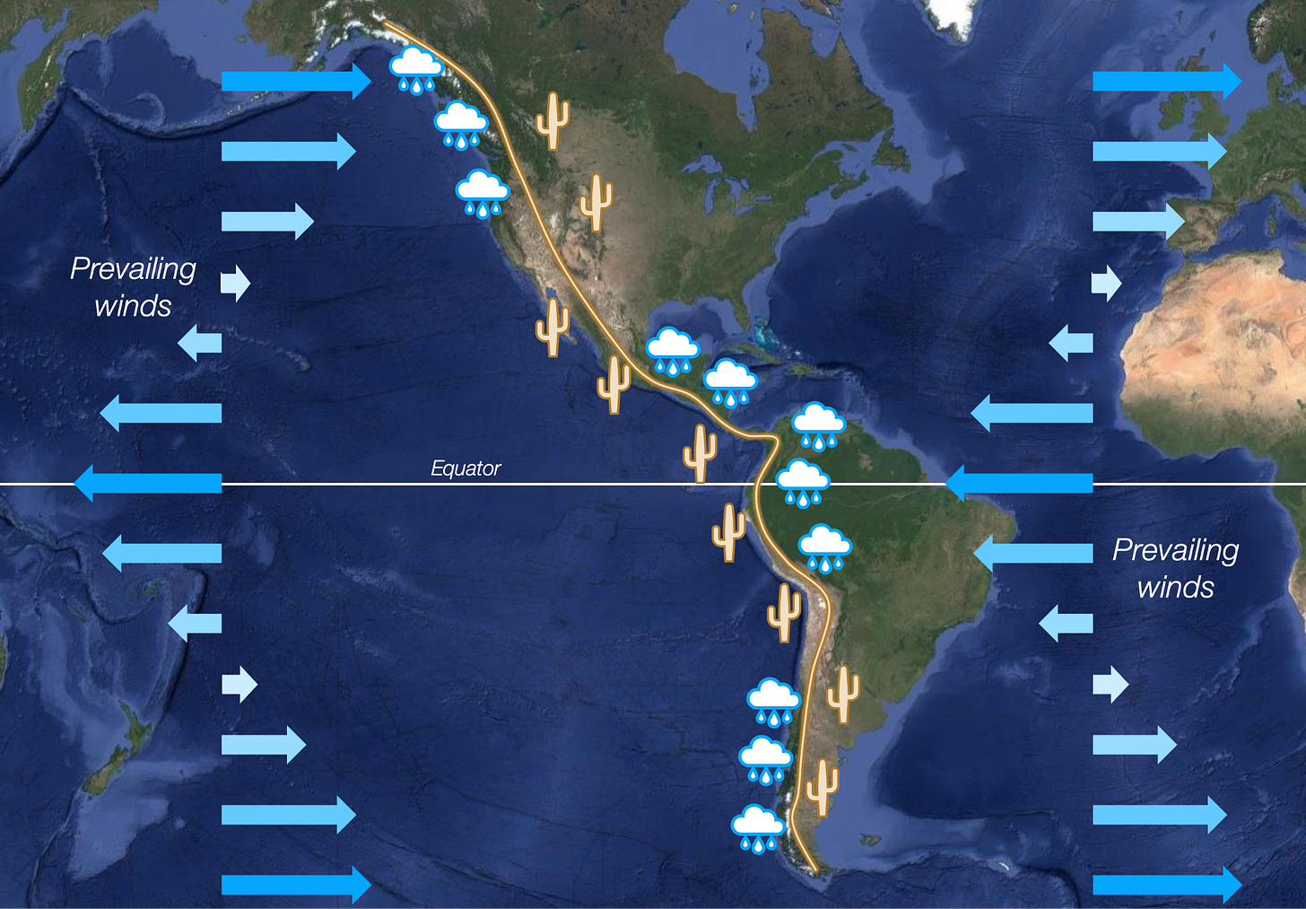 This makes the US West Coast, the Amazon, and southern Chile very wet. But these rains also affect the north of Argentina, feeding the Río de la Plata basin, and dropping tons of water on the eastern Andes: