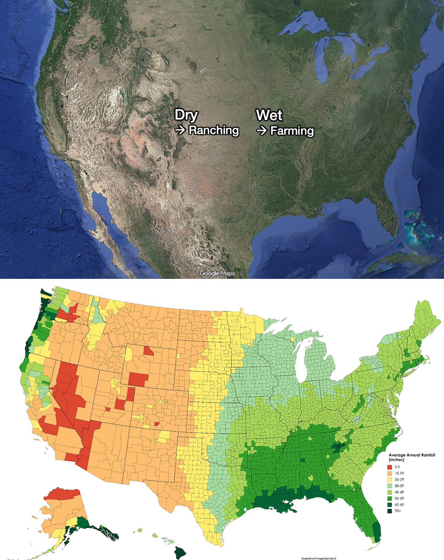 The US has a sea to its south that affects the rains,2 so instead of a north-south difference, it has an east-west one. This determines the type of food it produces: