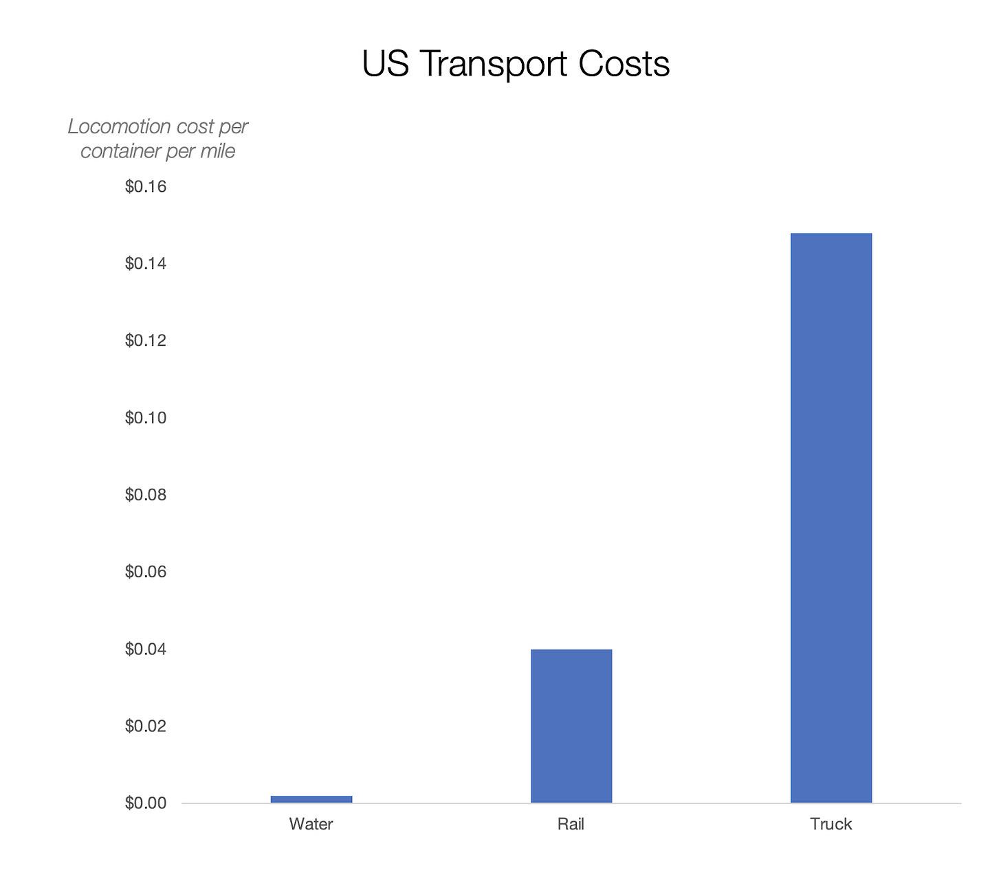 Recuerda que el transporte por agua es entre 10 y 30 veces más barato que el terrestre, y que reducir a la mitad los costos de transporte puede multiplicar el comercio hasta 16 veces! Si combinas estos efectos te das cuenta de que un buen transporte fluvial puede hacer que una región sea cientos de veces más rica. Los agricultores estadounidenses y argentinos pueden ganar mucho más dinero, acumular más capital e invertir con mayor facilidad que los de otros países.