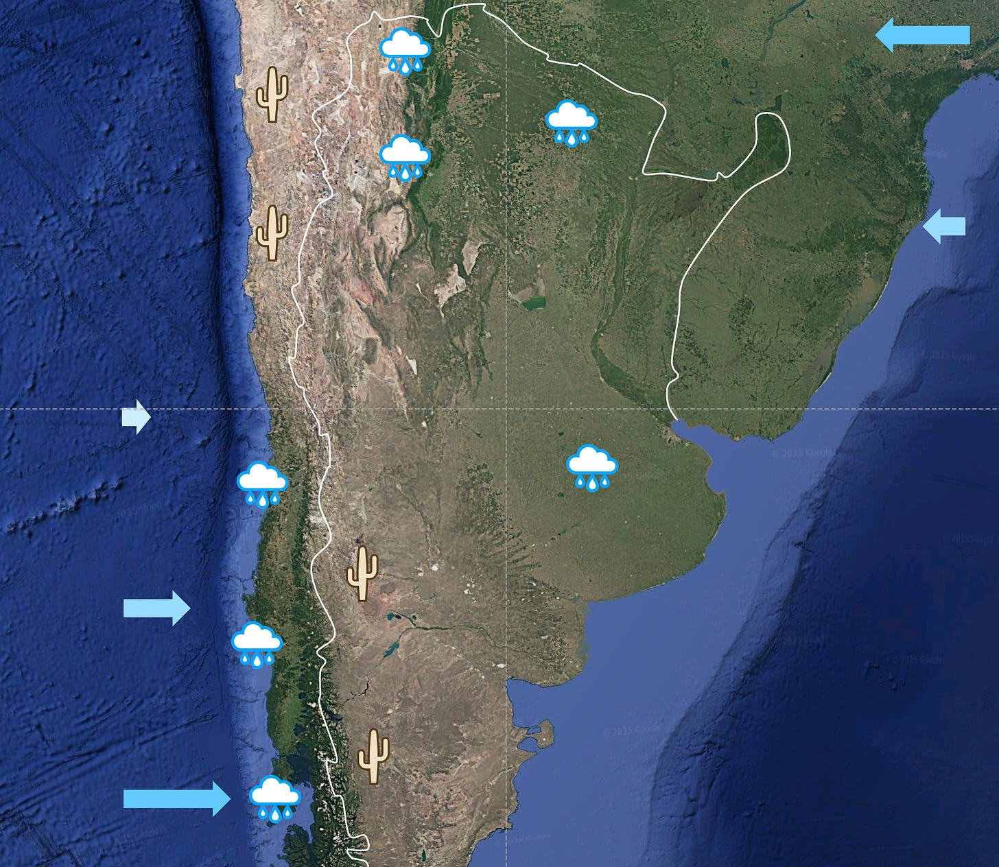 Esto hace que la costa oeste de Estados Unidos, la Amazonia y el sur de Chile sean muy húmedos. Pero esas lluvias también afectan al norte de Argentina, alimentando la cuenca del Río de la Plata y dejando enormes cantidades de agua sobre los Andes orientales.