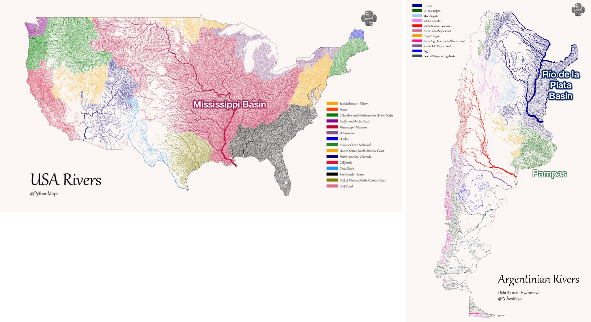 Also, whereas the Mississippi Basin irrigates the US Midwest, the Rio de la Plata Basin doesn’t irrigate the Pampas, which must rely mostly on rain for agriculture.