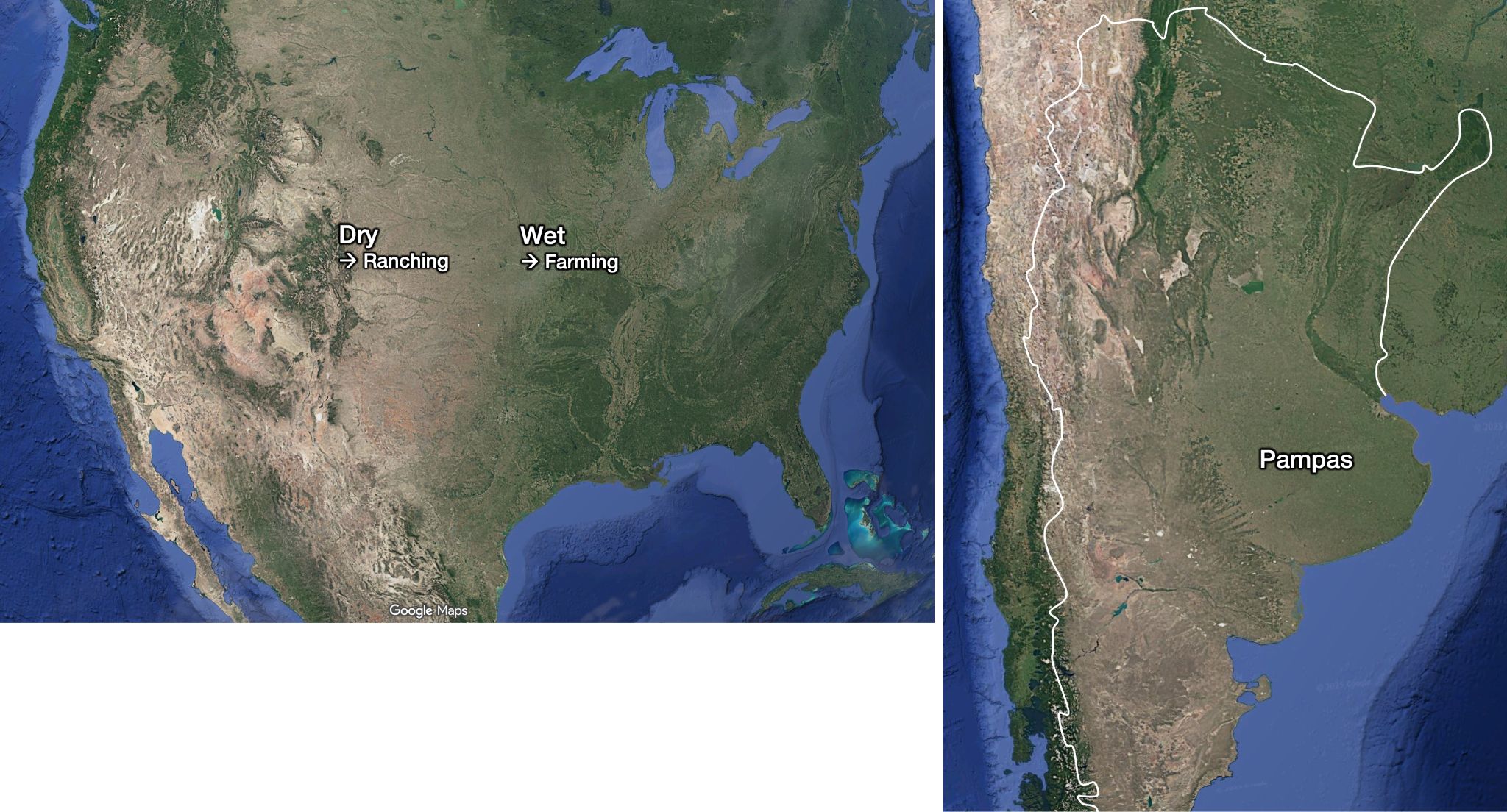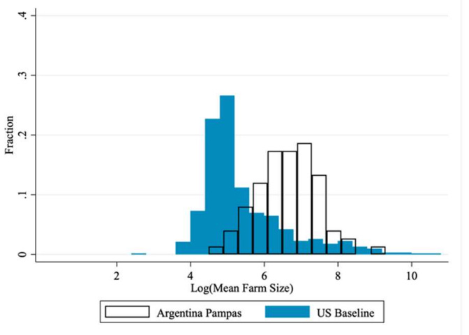 US East Coast farms were small, but those in states like Texas, Oklahoma, Kansas, or Missouri were much bigger—just 33% smaller than those in the Argentinian Pampas. Why? The climate in the Pampas is most similar to the climate in these Midwest states.