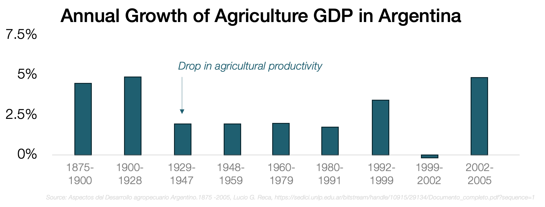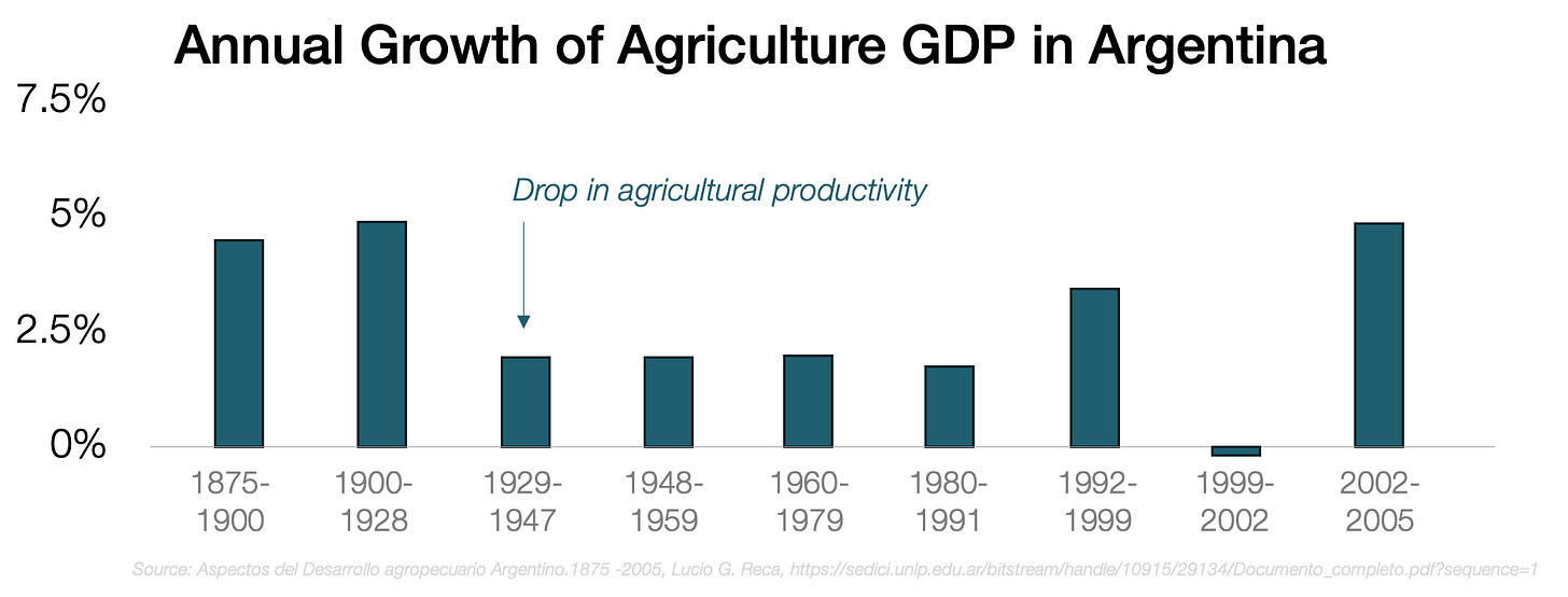 It’s fair, then, to say that most of Argentina’s economy was agricultural during the country’s apogee, so the original problem in Argentina’s economy must be linked to it: Somehow, Argentina’s agricultural productivity slowed down, and the economy never fully moved on from its dependence on it. Why?