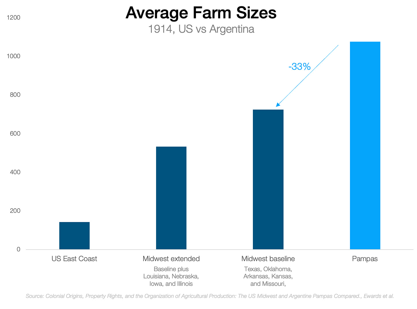 We saw that the majority of the farm size gap between the US and Argentina was due to geography, but not all, as Argentinian farms are still bigger than in the US region where they’re biggest. This paper suggests that the other cause of big farms was institutions: Spain and the UK had different ones, and they transposed them into Argentina and the US respectively.3