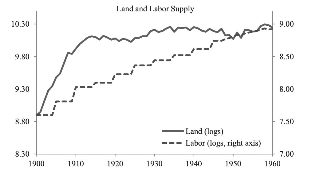 Crop production boomed in the late 1800s: Wheat acreage increased by ~5x between 1890 and 1910.2 93% of the increase in agricultural production until 1930 was due to the addition of new arable land. But that growth decelerated heavily in the early 1900s: