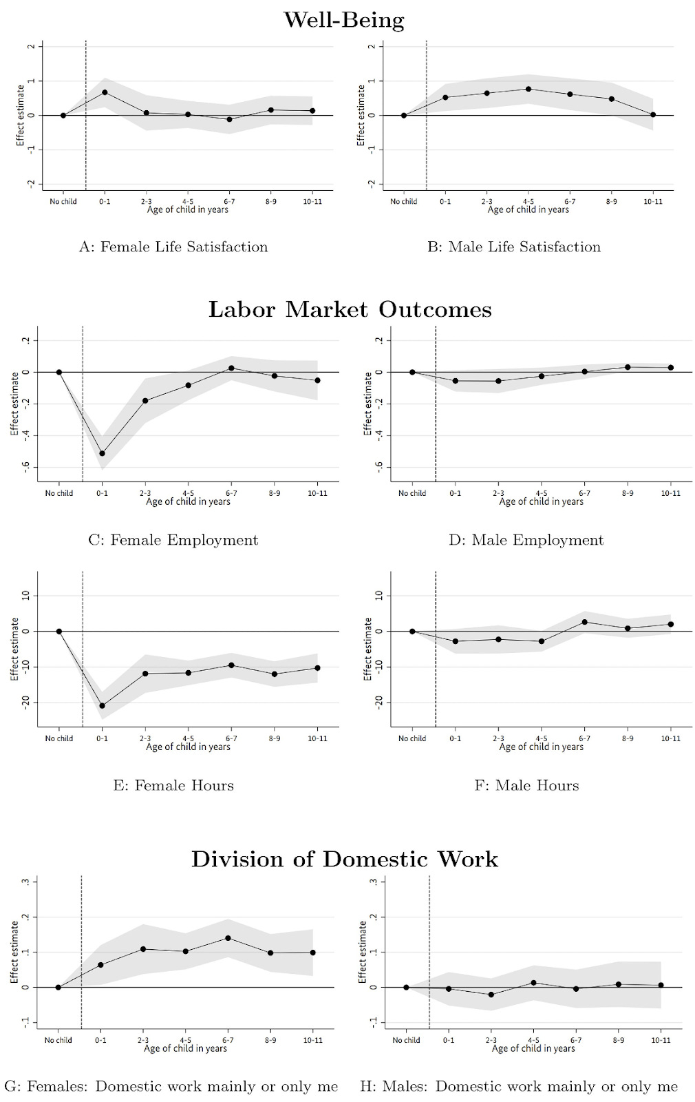 Women’s happiness is neutral, their professional work hours go down, and their household work hours increase. Meanwhile, men’s work and chore hours stay the same, while happiness grows. This suggests women are unhappy with the deal they get with childbearing vs men, probably linked to chores.