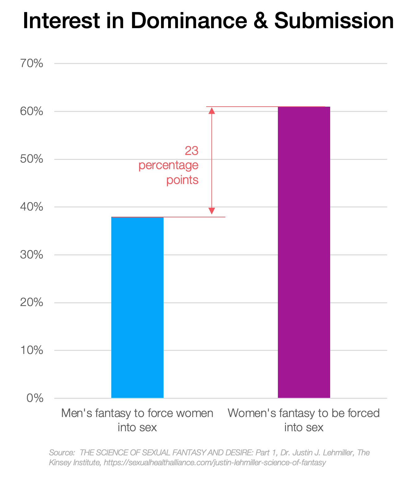 The conundrum is why would women have this fantasy more than men? After all, forcing into sex is likely to have more downsides for women (having children of fathers they don’t like, being hurt, dying) than men.