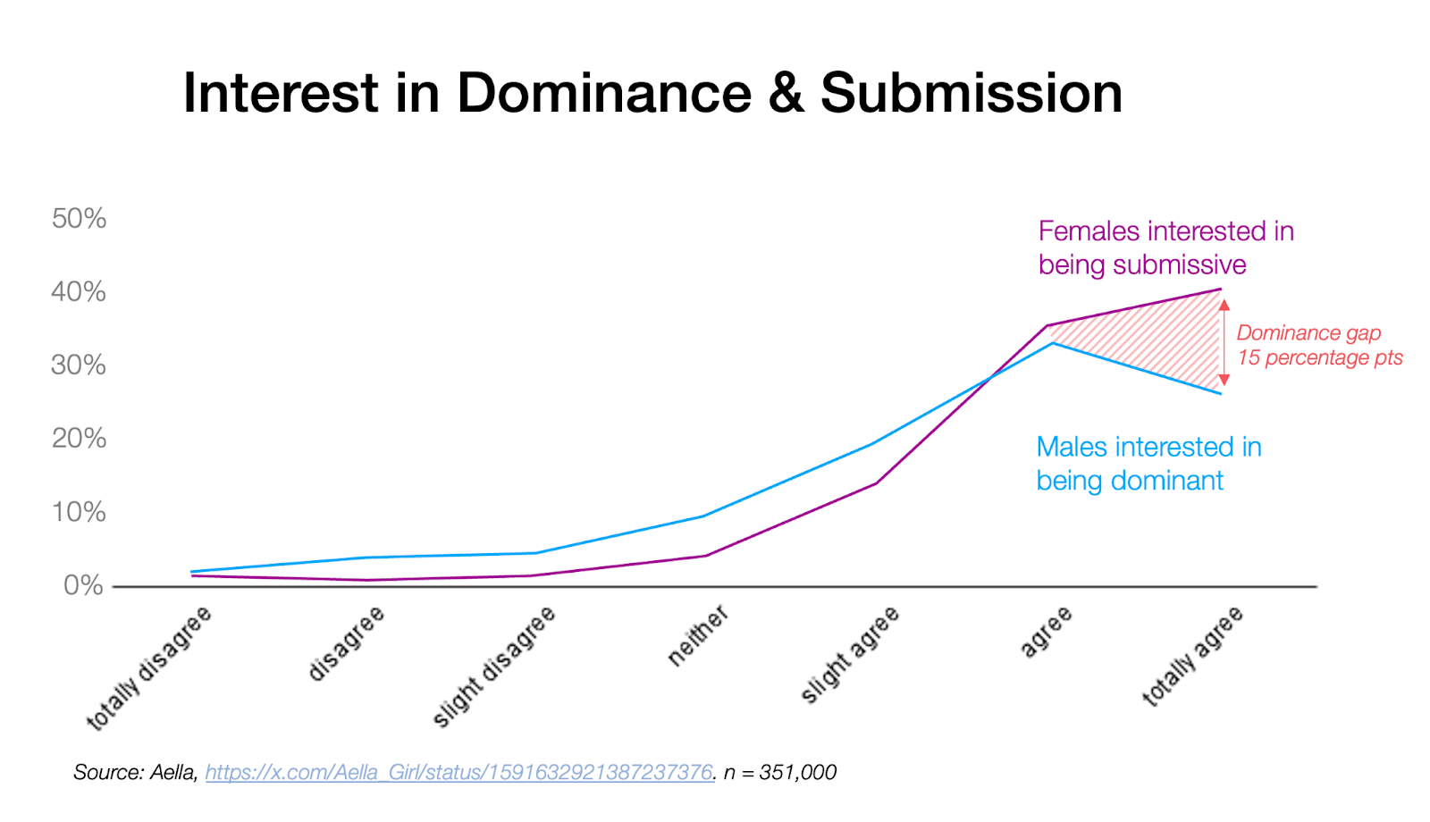 This dominance gap is weird, isn’t it? I can imagine why men are aroused by it: Evolutionarily, a violent man could force his way into sex more than a non-violent man, therefore reproducing more. I can also imagine why women are aroused by it, for the same reason: They would sire sons that are more likely to have children.2