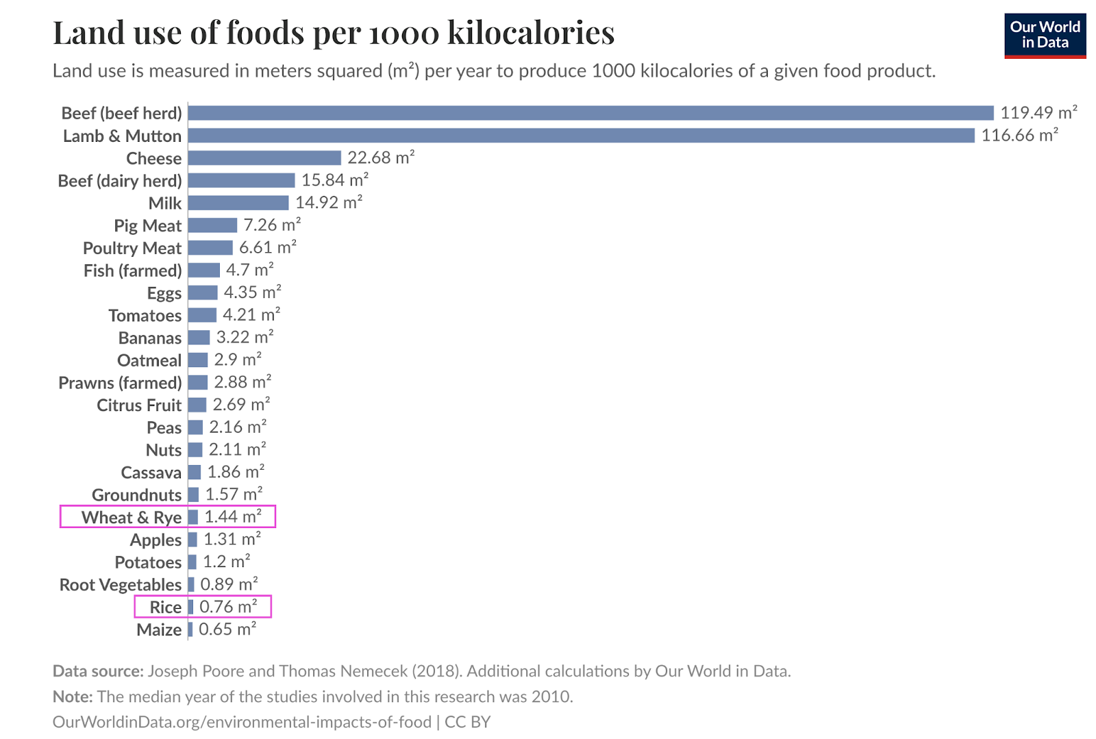 This means that rice nourishes families on half the land that wheat requires.