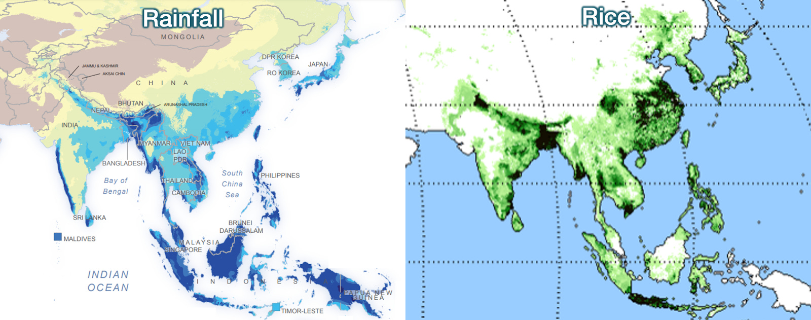 Rice crops vs rainfall, side by side: