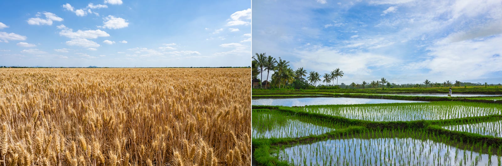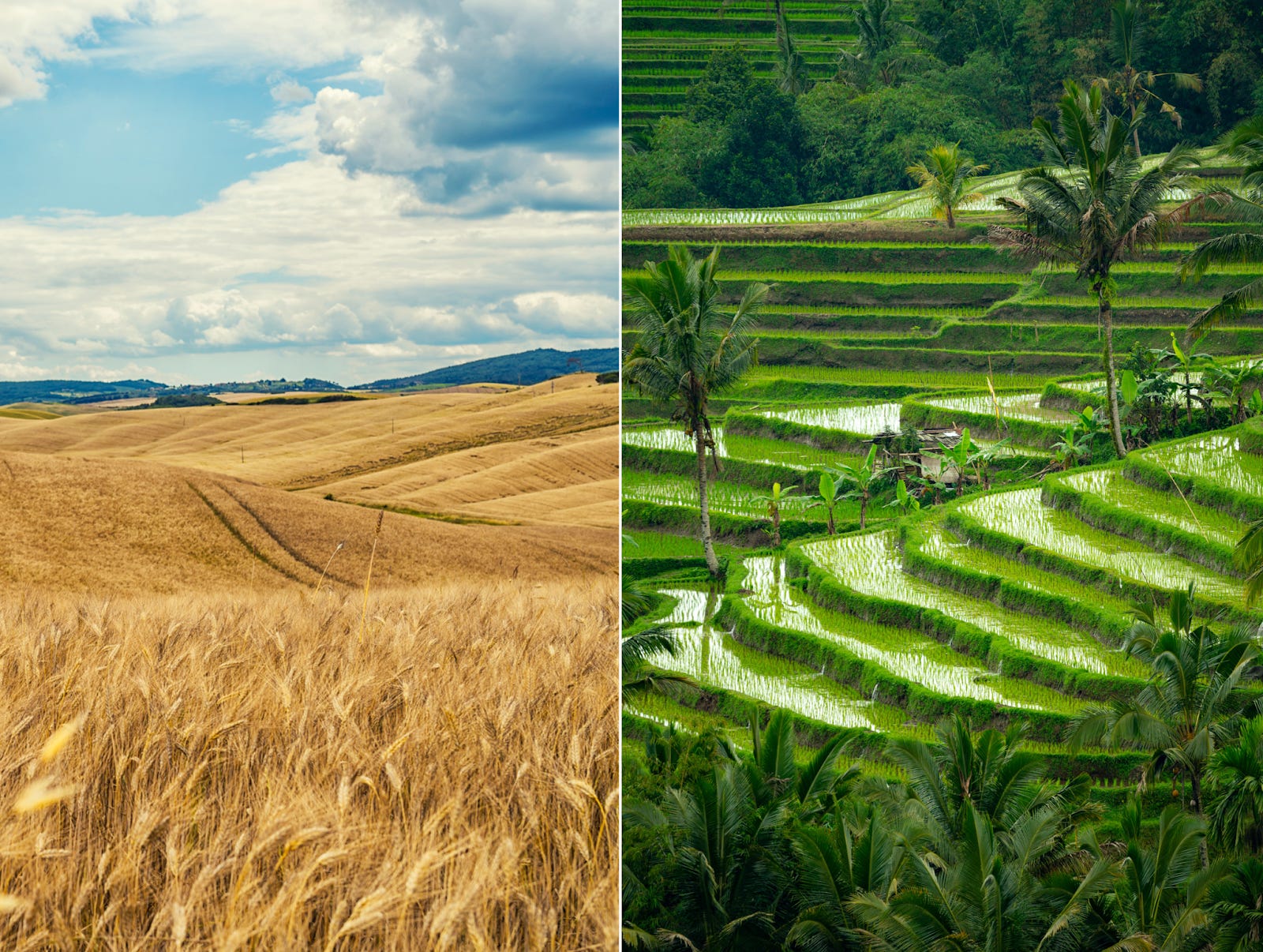 Flooding rots wheat but can 3x the yields of rice.1 That makes wheat well adapted to hills, whereas rice can only survive on hills when they are terraced:
