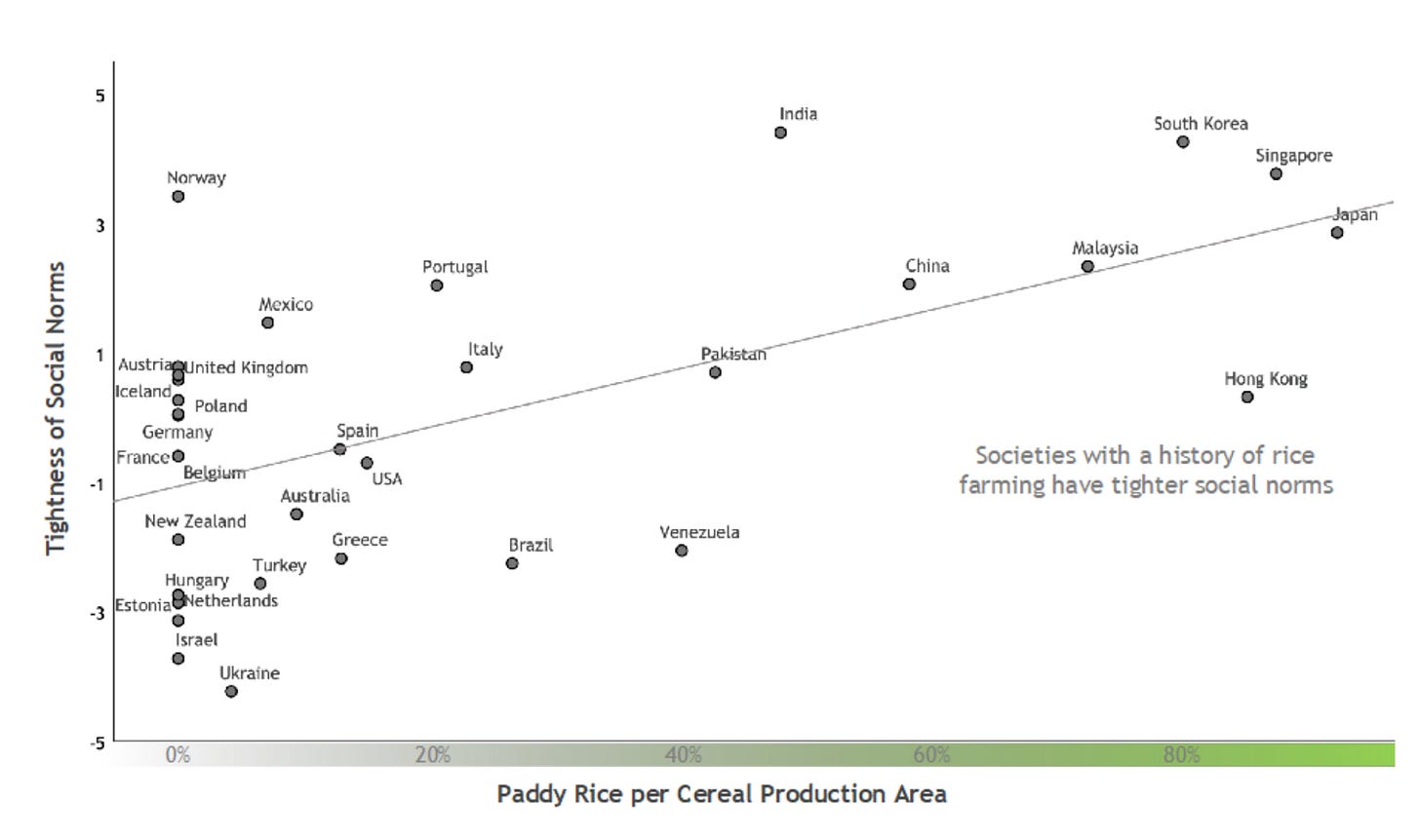 Rice-farming nations had tighter social norms than wheat or herding nations.