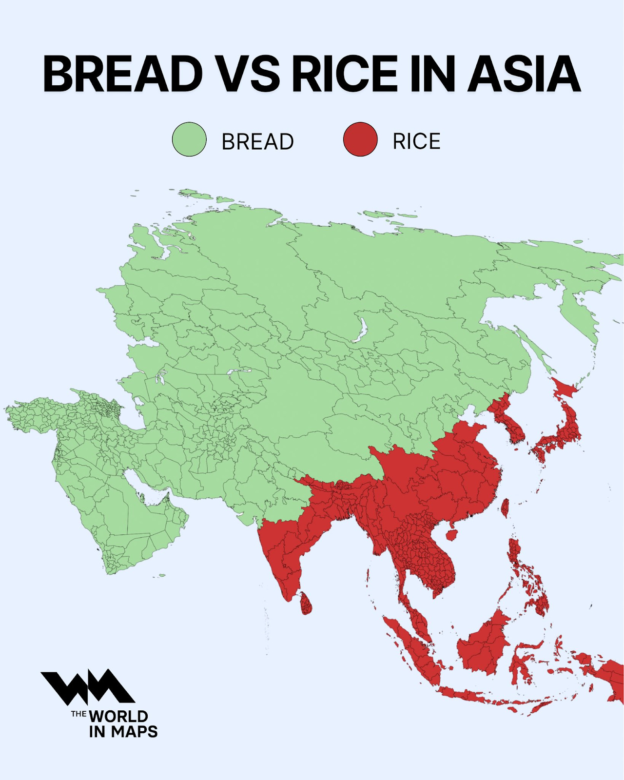Wheat and rice are not harvested in the same places. Rice and bread are the predominant food where rice and wheat are respectively the predominant crops. Here’s another way to look at the same data: