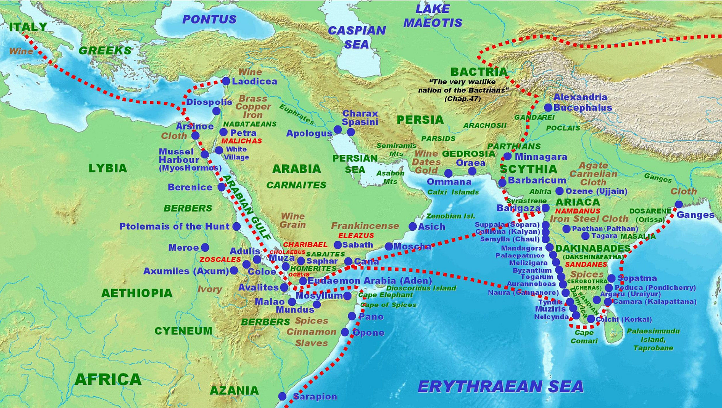 Notice on the trade map above that there were no stops between Yemen and the Mediterranean on the Arabian coast. That’s how awfully dry that region is: not even port settlements could survive.