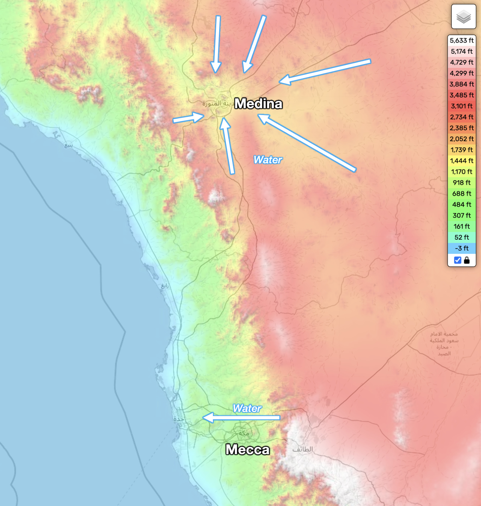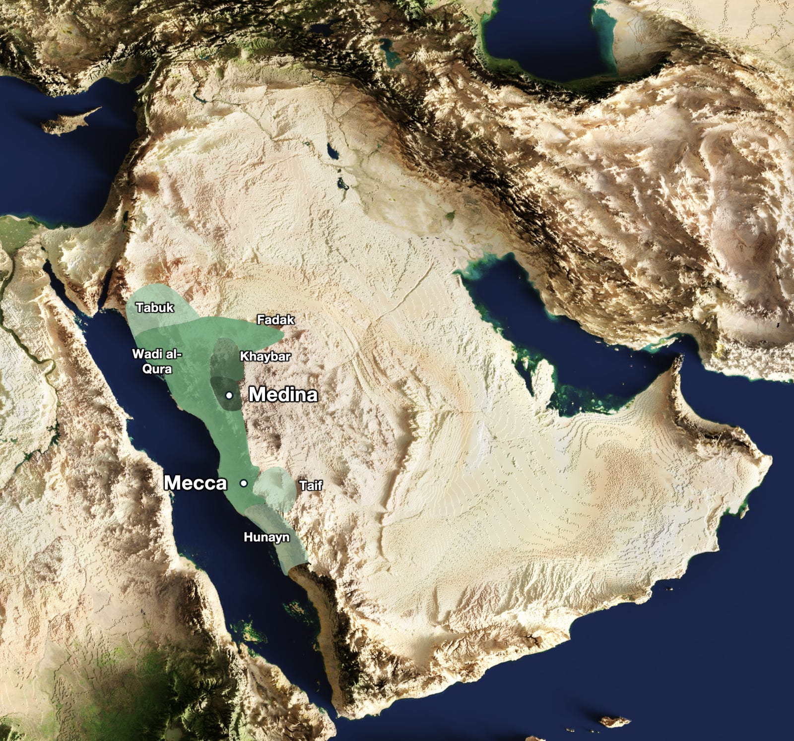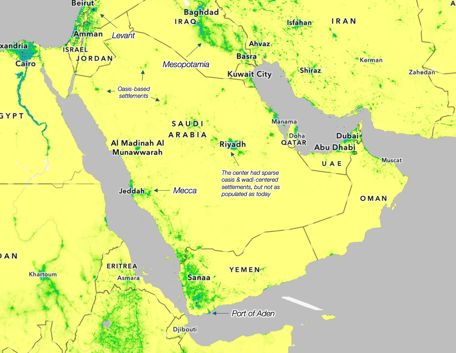 That’s why Mecca and Medina are inland: They’re away from the sea trade routes and isolated by mountains and desert, but they have some water caught by the mountains.