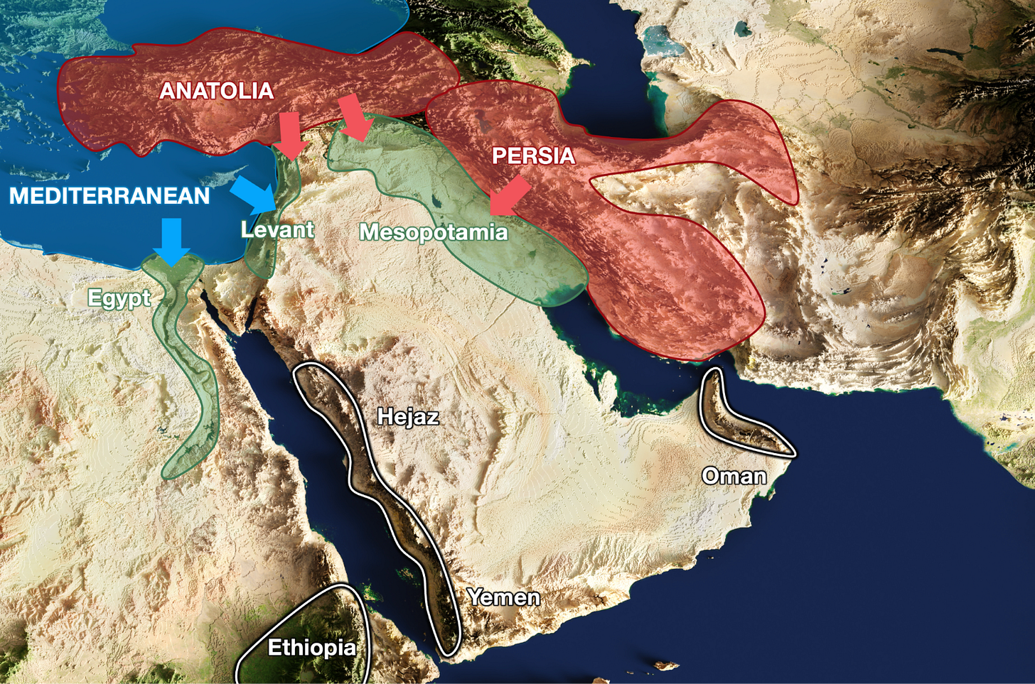 Three bordering lands (Egypt, Levant, Mesopotamia) were easy to conquer as they have few mountains to protect them and are close to Arabia: Egypt, the Levant, and Mesopotamia