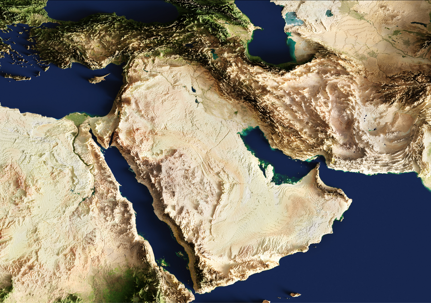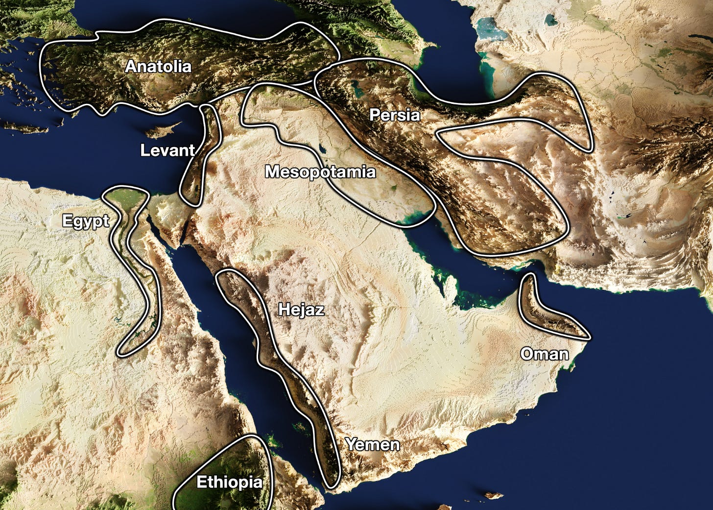 Just north of that, the same phenomenon, but the water from the Mediterranean forms the Levant, with present-day Israel, Palestine, Lebanon, and Syria.