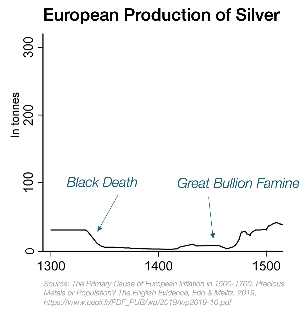 For a century, there was more coin than people, so they didn’t notice when silver and gold production slowed down. But it did; first, because of fewer miners.