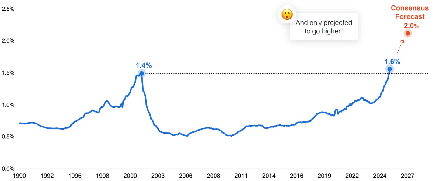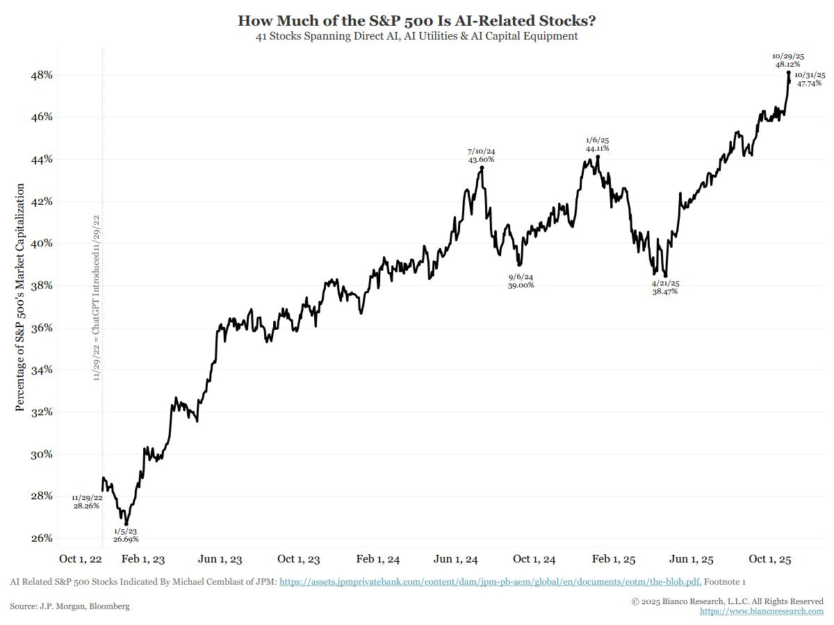 This is single-handedly driven by the impact of AI, which accounted for 85% of the gain in US stocks so far in 2025!1 AI companies now make up half of the S&P500!
