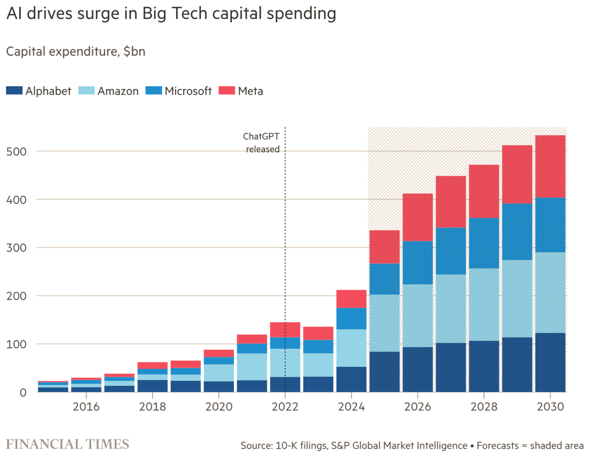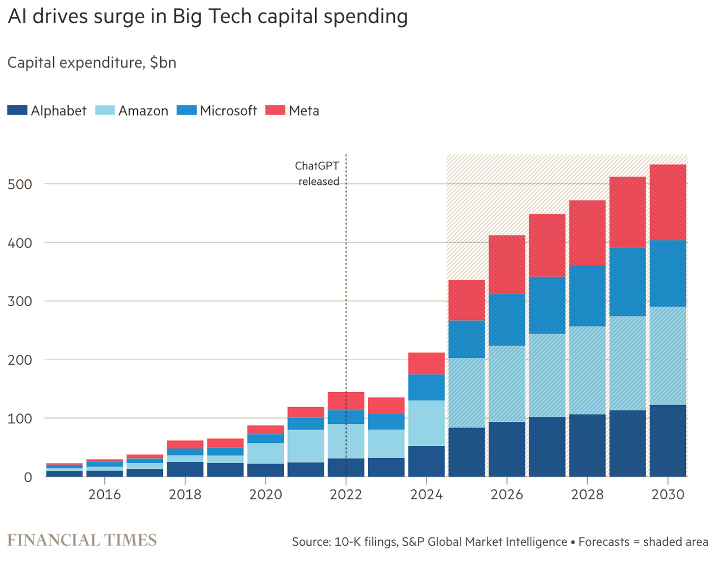 The outsized valuations Buffett is preying on are based on the promise that AI will make these companies a ton of money. For that, they need to invest a lot upfront in chips, data centers, servers, software… This is so much investment that ~45% of the US economy’s growth so far in 2025 is due to AI build-up! A lot of it comes from the top 4 biggest AI companies.