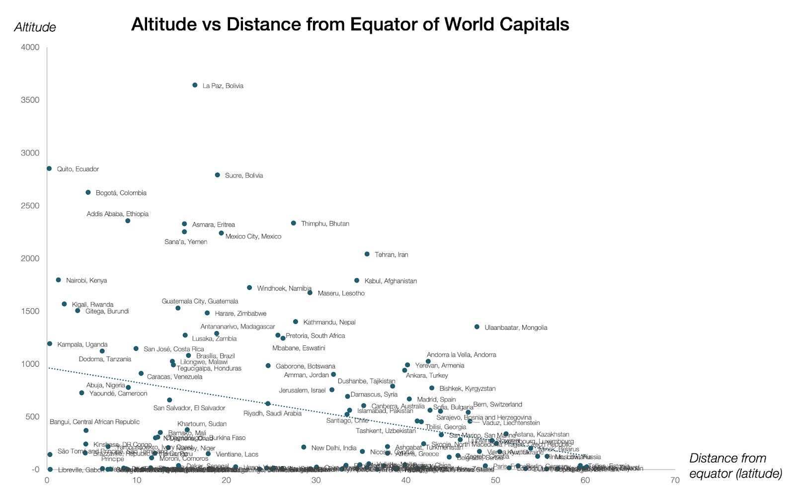 But if you look at the altitude and distance from the equator of the capitals of the world, a clear pattern emerges: