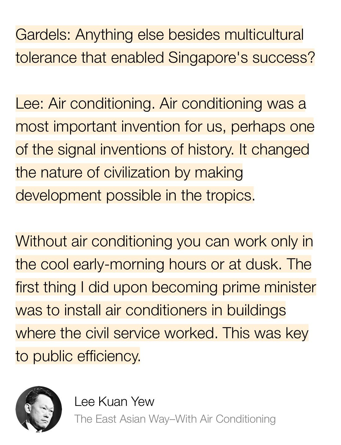 As I mentioned here, AC has been a crucial tool to develop the US South, and AC is the first thing Lee Kwan Yew implemented when he founded Singapore: