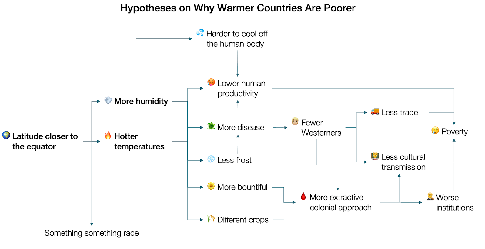 But there’s one theory that I haven’t seen anywhere yet, and that I think is crucial to explain the majority of this phenomenon. So today, I’d like to review what people think causes warm countries to be poorer, and then explain why this other factor is so crucial.