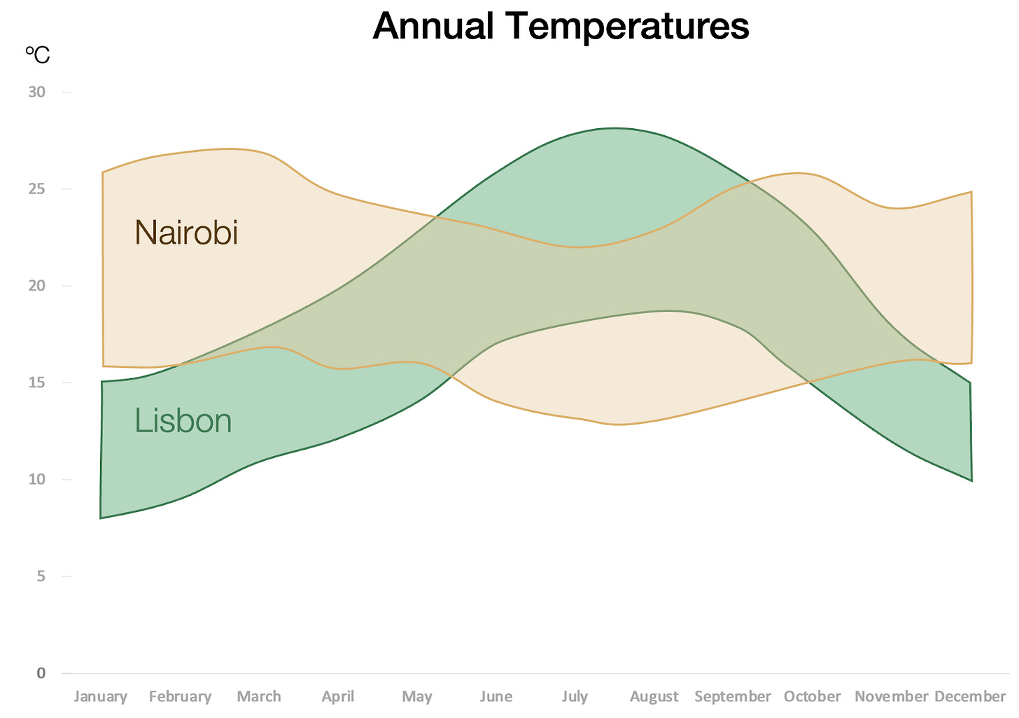 Here are the temperatures of Nairobi (Kenya’s capital) and Lisbon (Portugal’s):