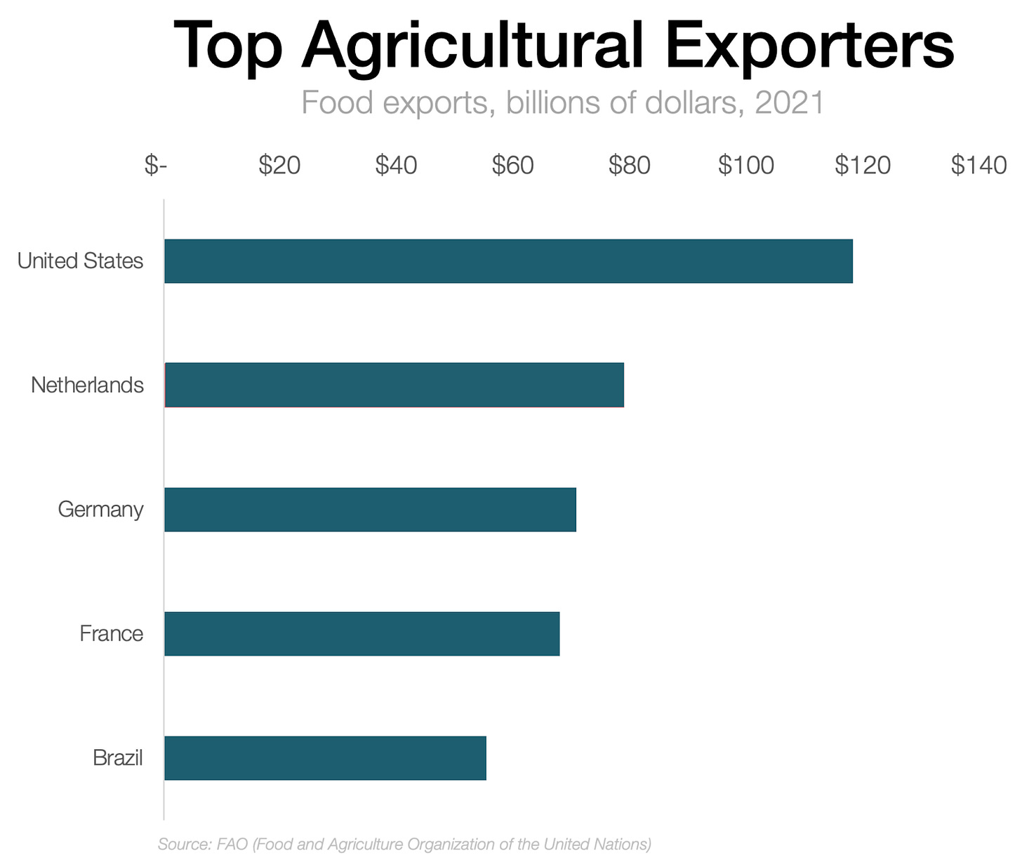 The US, the Netherlands, Germany and France are the top 4 agricultural exporters in the world.