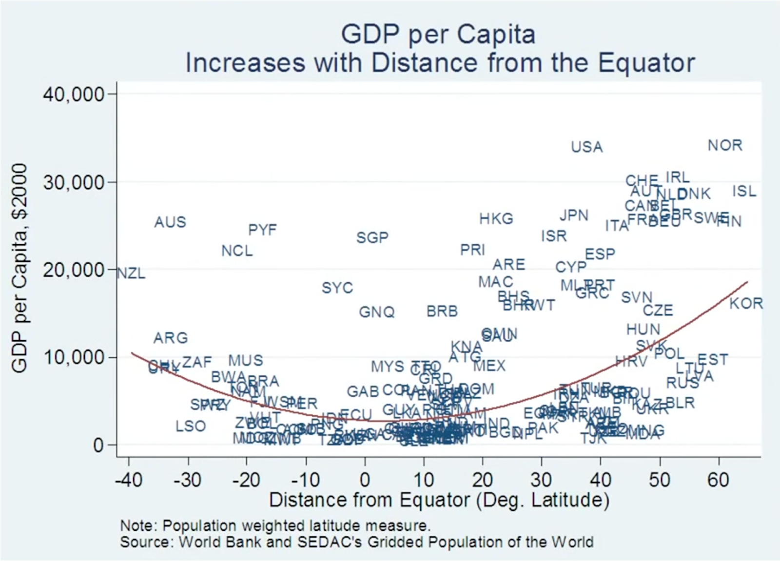 Cold weather forces individuals to delay consumption and save for the future. The incentive structure completely changes or you die which is a self selection in itself. In warm climates with abundant food year round, there are strong physical demands but there is less thought required. In colder climates, the entire culture needs to be built around protecting yourself from the weather and saving food. This creates a culture that is more adept to the modern economy of specializing. That is the number one determinant of why warm countries are poorer.