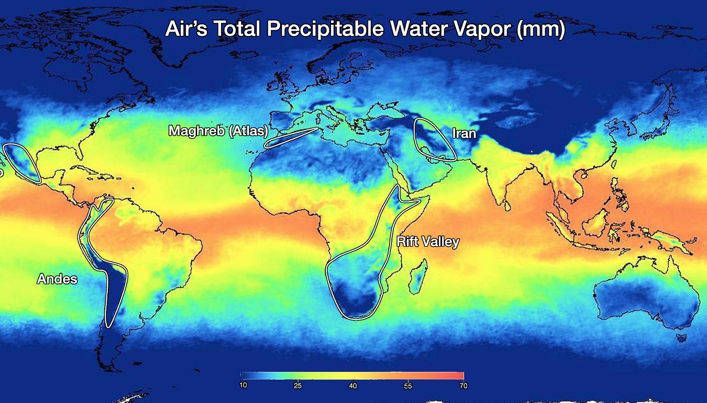 Notice how there is much less water vapor in the air in mountainous areas than close to sea level. This other dew point map is not as pretty, but shows directly how the dew point is lower in mountains.