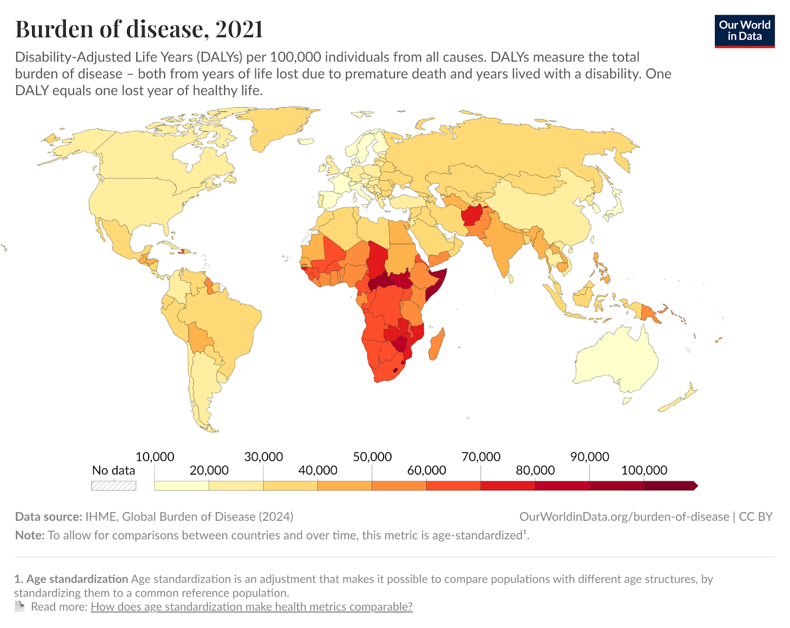 But what’s the causality? It’s clear that warmth makes countries poorer, and obviously poorer countries invest less in healthcare and so have more disease. But as we saw in Climate Caused the US Civil War, warmth also reduces health directly, because diseases like malaria, dengue, yellow fever, tuberculosis, or parasitic worms are endemic in these regions: They thrive in warm, humid environments.4