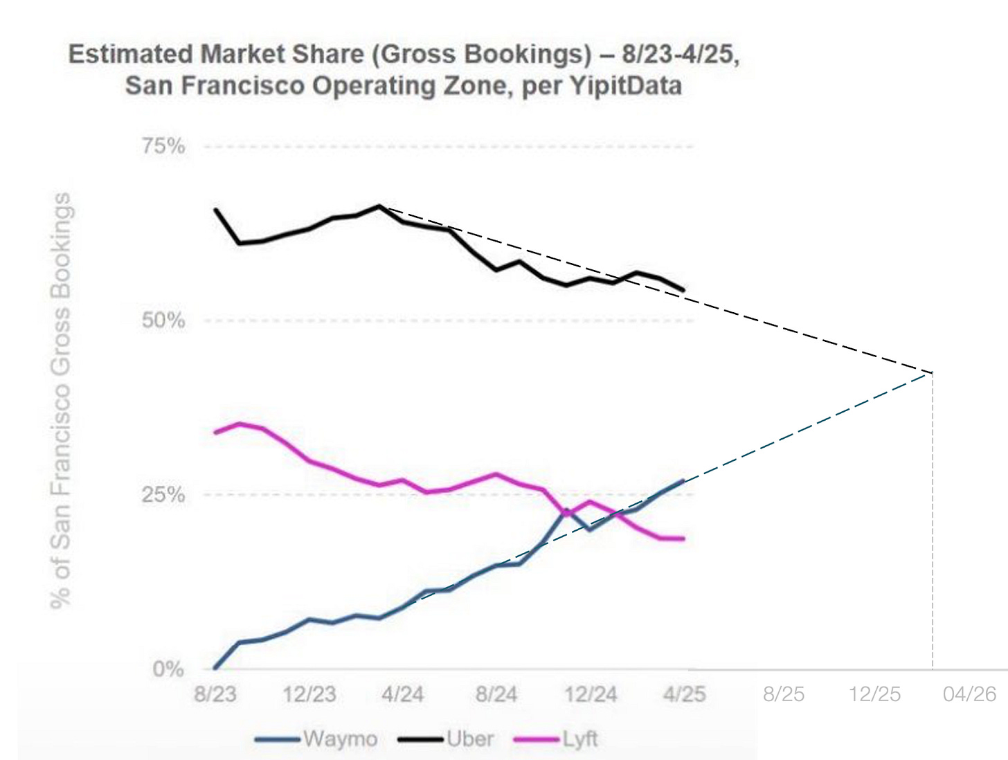 And Waymo is destroying the competition. It has surpassed Lyft in rides in SF, and is on track to surpass Uber within 8 months or so:
