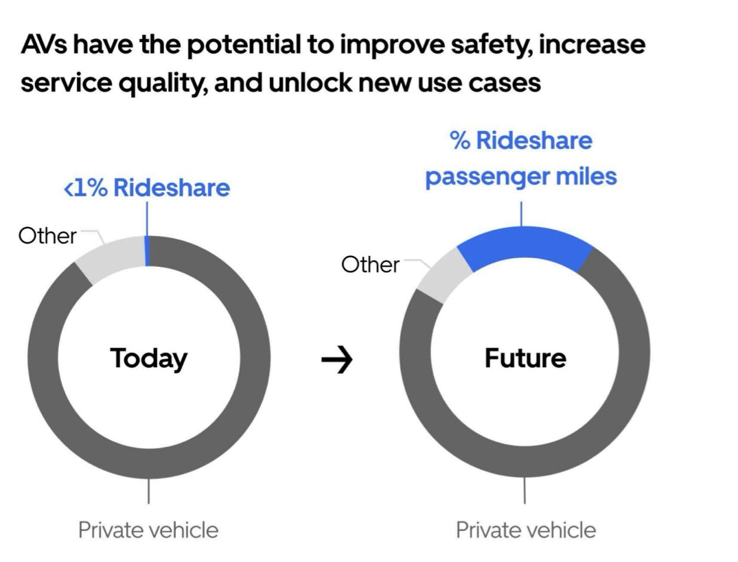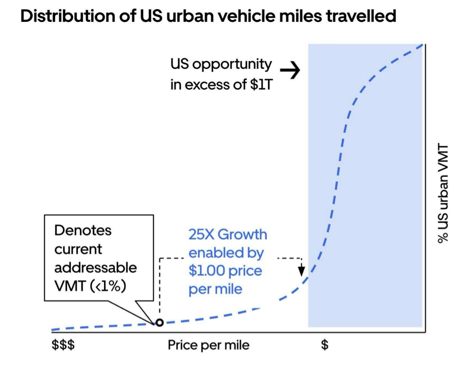 But the bigger story is not just that they’re going to crush the competition. It’s that robotaxis will make the market size explode. Uber said ride-hailing could grow by 25x if its price dropped under $1/mile.