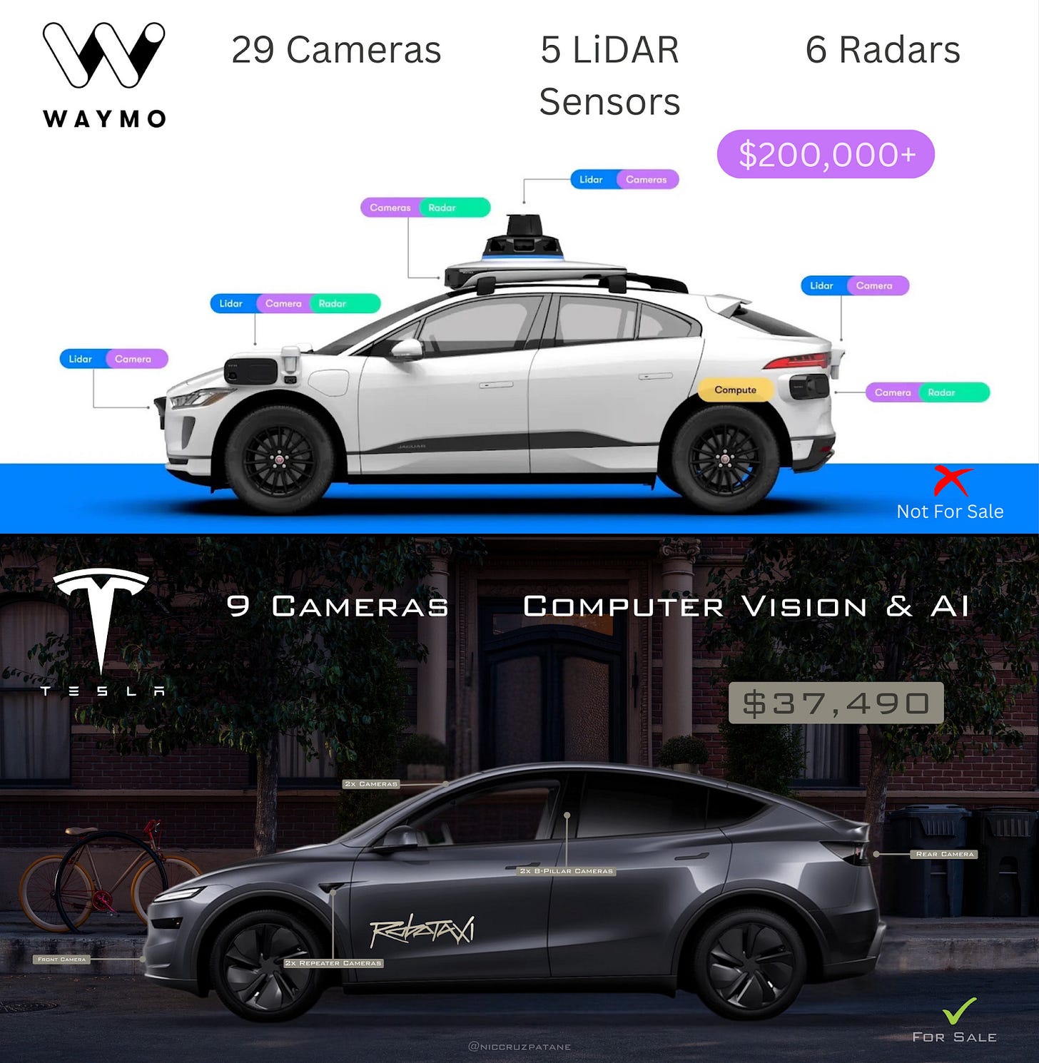 A key input is going to be the cost of each car: The cheaper they are, the cheaper the price tag can be, and the more competitive they will be. And Tesla’s cars will be nearly an order of magnitude cheaper than Waymo’s: