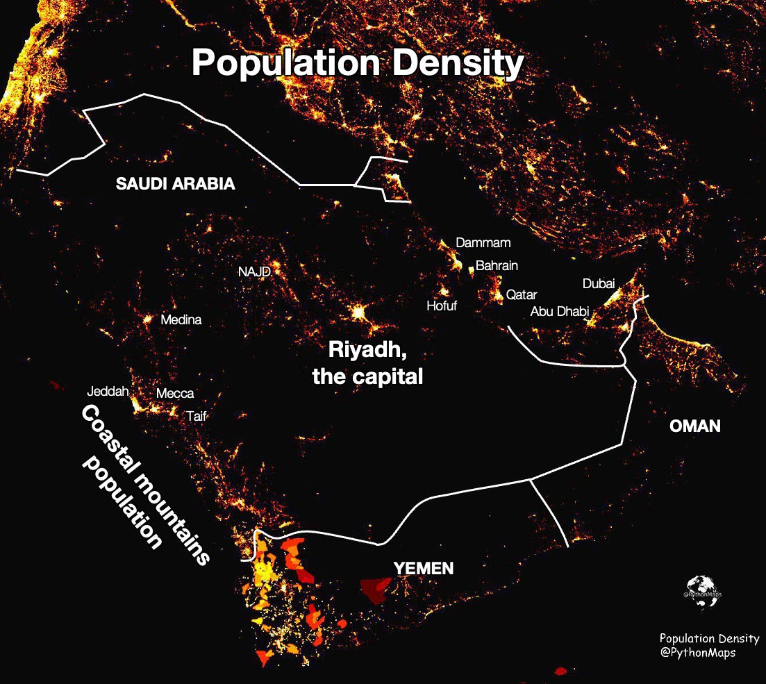 But the capital of Saudi Arabia is not in this richer, populous region! It’s in Riyadh, nearer the center, in a more desertic region called the Nadj. Why?