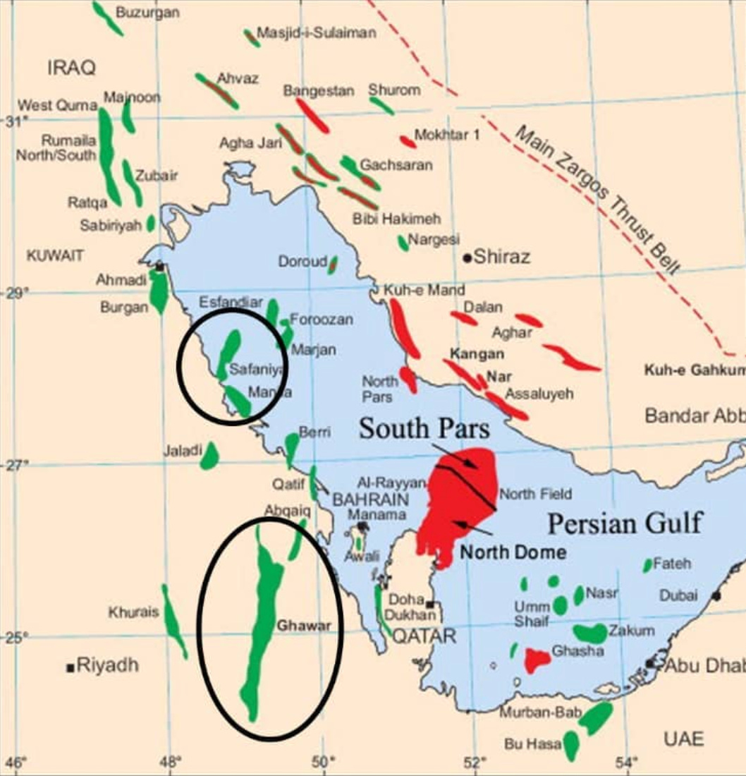 The east coast of Saudi Arabia has the biggest onshore and the biggest offshore oil fields in the world.
