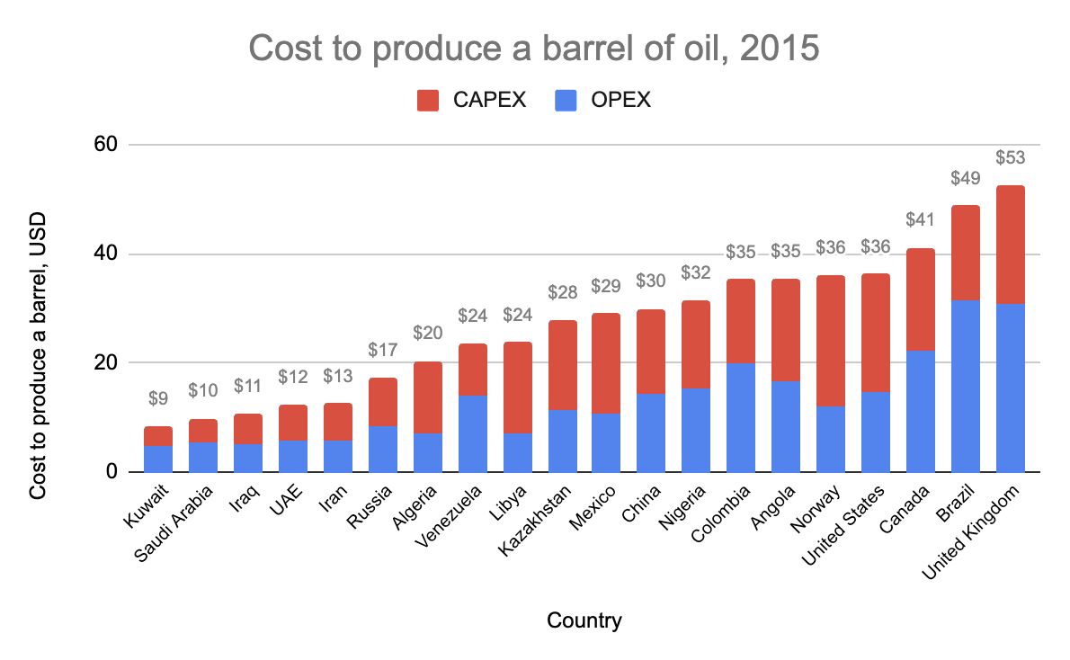 That’s because Saudi Arabia’s oil is in huge fields, mostly onshore, near the surface, easy to access, a lot of it spurts out of the ground without much effort, and the fields are close to the coast, so it’s cheap to get it there.