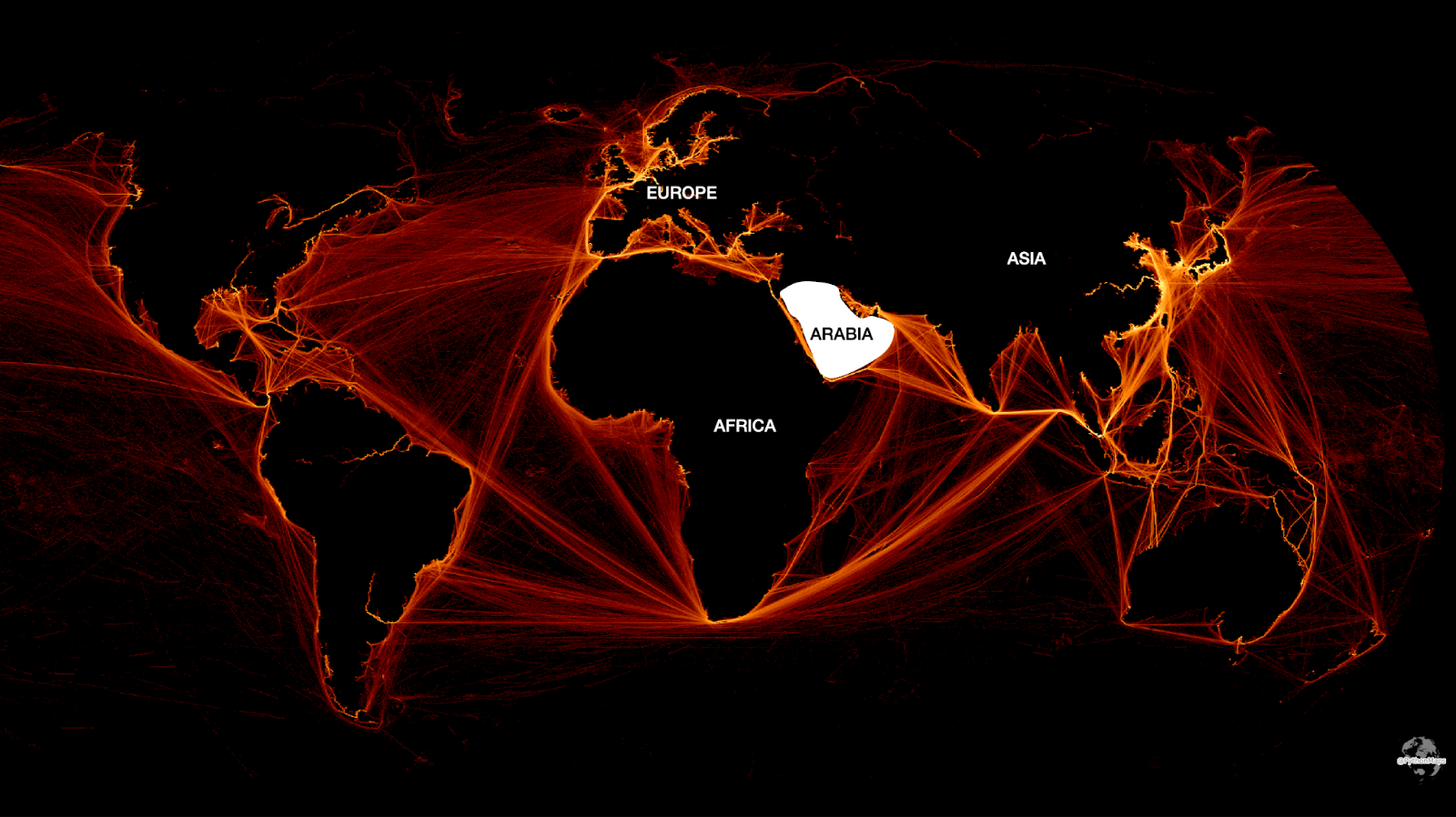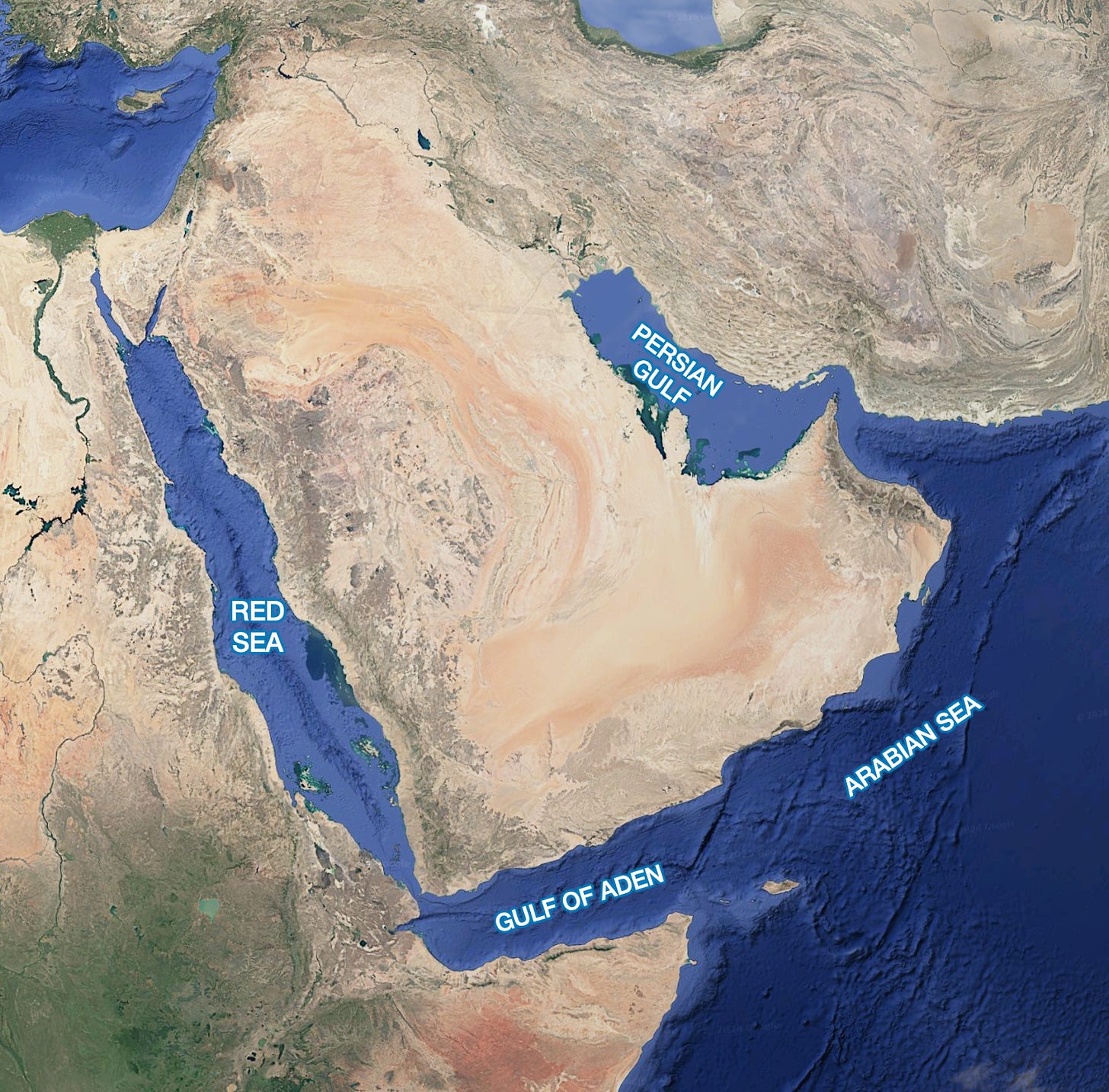 Virtually everything that moves between Europe, Asia, and Africa moves along the border seas of Arabia, pretty close to the coast because the passages are narrow: