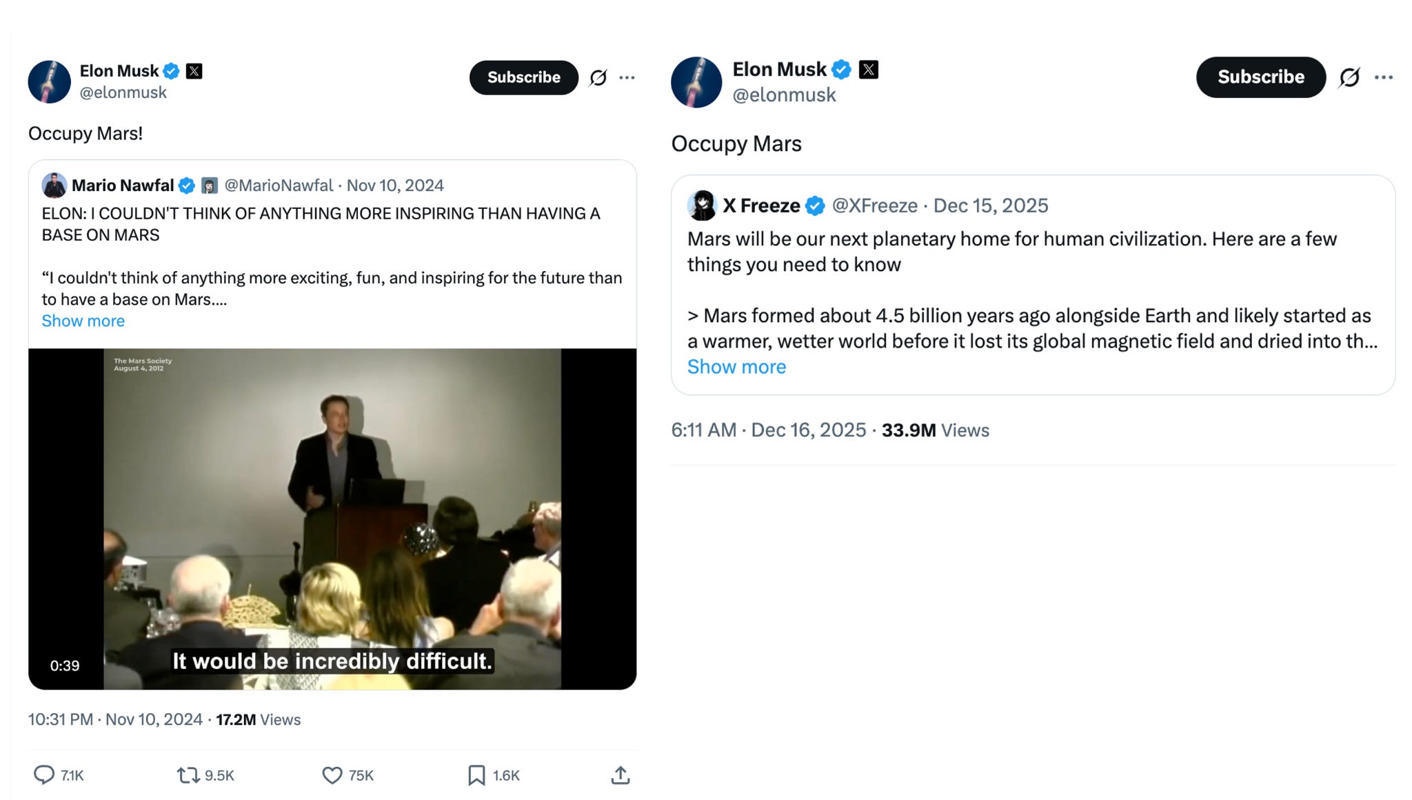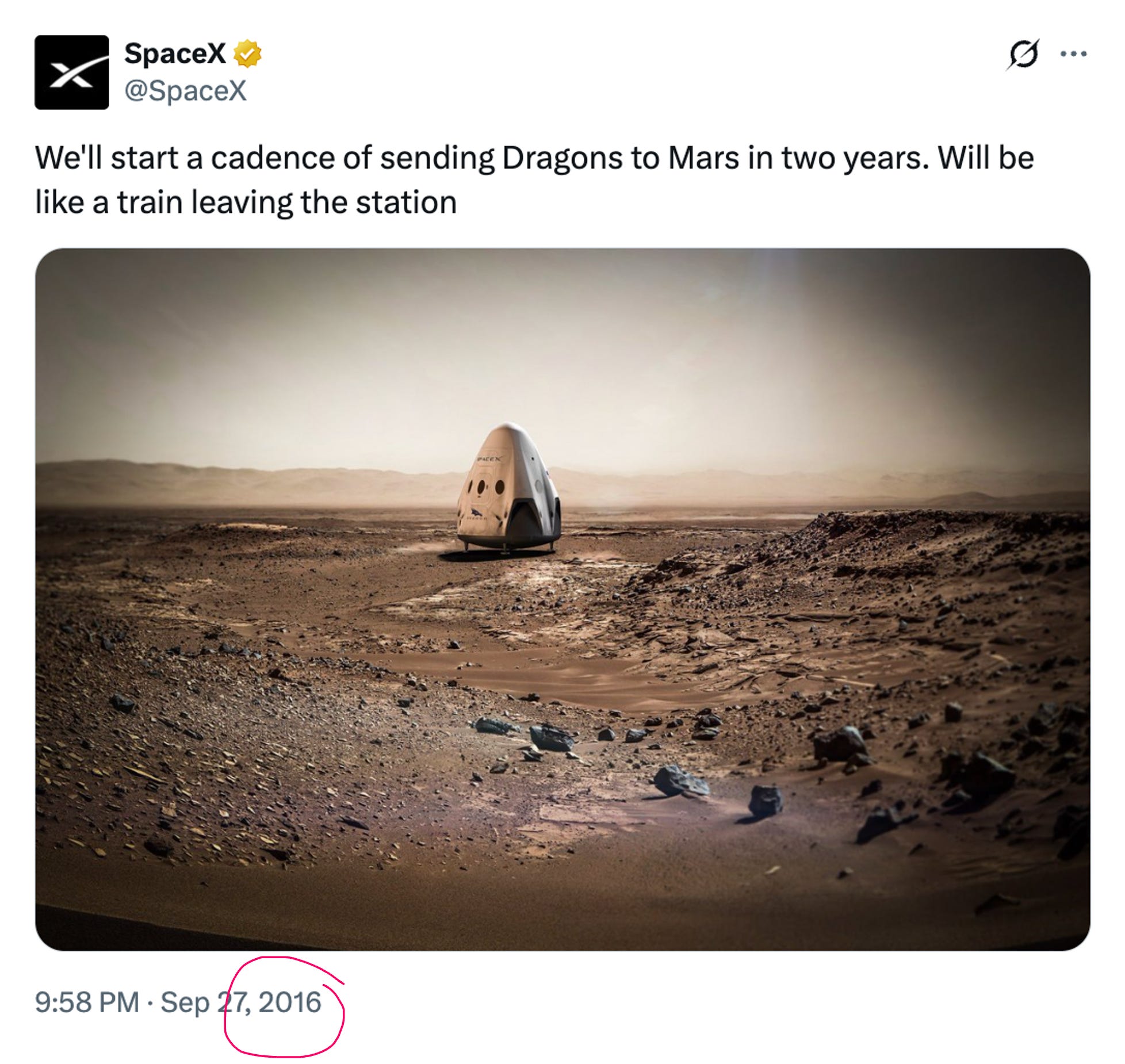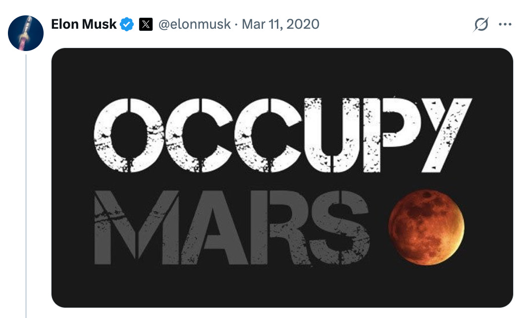 So the official reading is that SpaceX needs to iterate much faster on landing on another celestial body, building a habitat there, industries, and resupplying them.