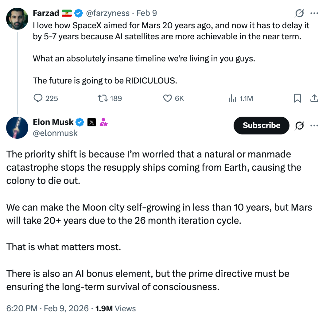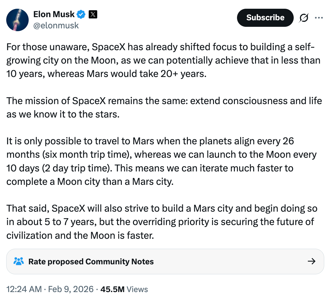 But now, suddenly, at the same time as SpaceX merges with xAI and they IPO, suddenly Musk pivots to the Moon: