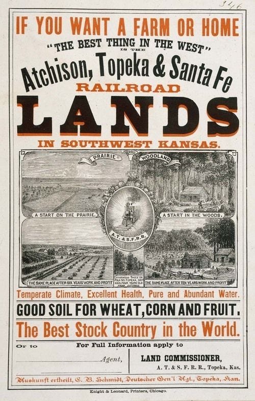 Early on, many railroads remained barely used, and lots of railroad companies went bankrupt. To avoid this, many became land management and immigration companies! In the US West, many railroads received large land grants (or bought huge tracts), so they were simultaneously selling transportation and the land that would generate the transportation demand. They created immigration bureaus, sometimes with offices in Europe, explicitly to seed farms and towns that would ship freight and buy tickets. They created towns, frequently integrated with water transportation companies to be multimodal.